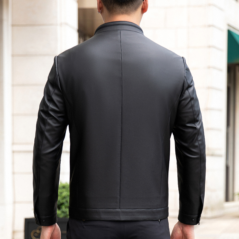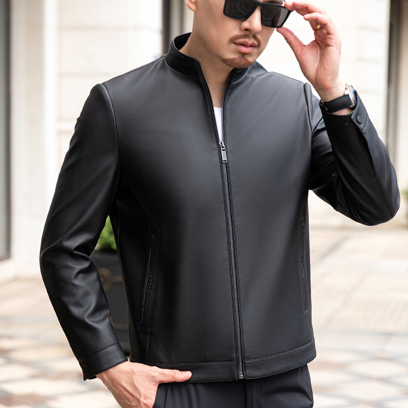 2023秋冬薄款外套夹克商务休闲时尚中年潮流百搭真皮皮衣男装--2339摩卡路 M/170 黑色(薄款)