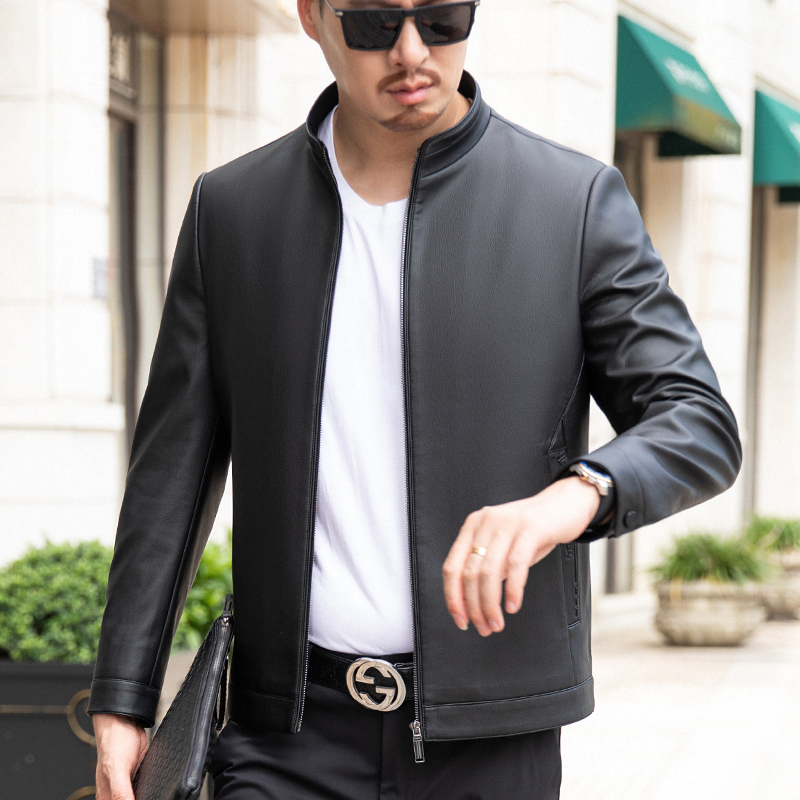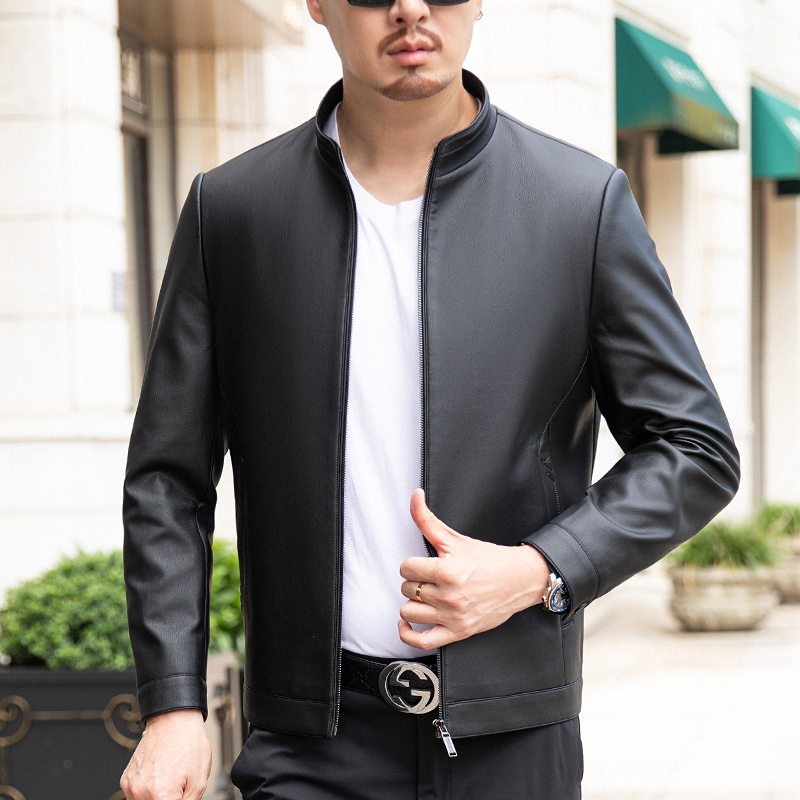 2023秋冬薄款外套夹克商务休闲时尚中年潮流百搭真皮皮衣男装--2339摩卡路 L/175 黑色(薄款)