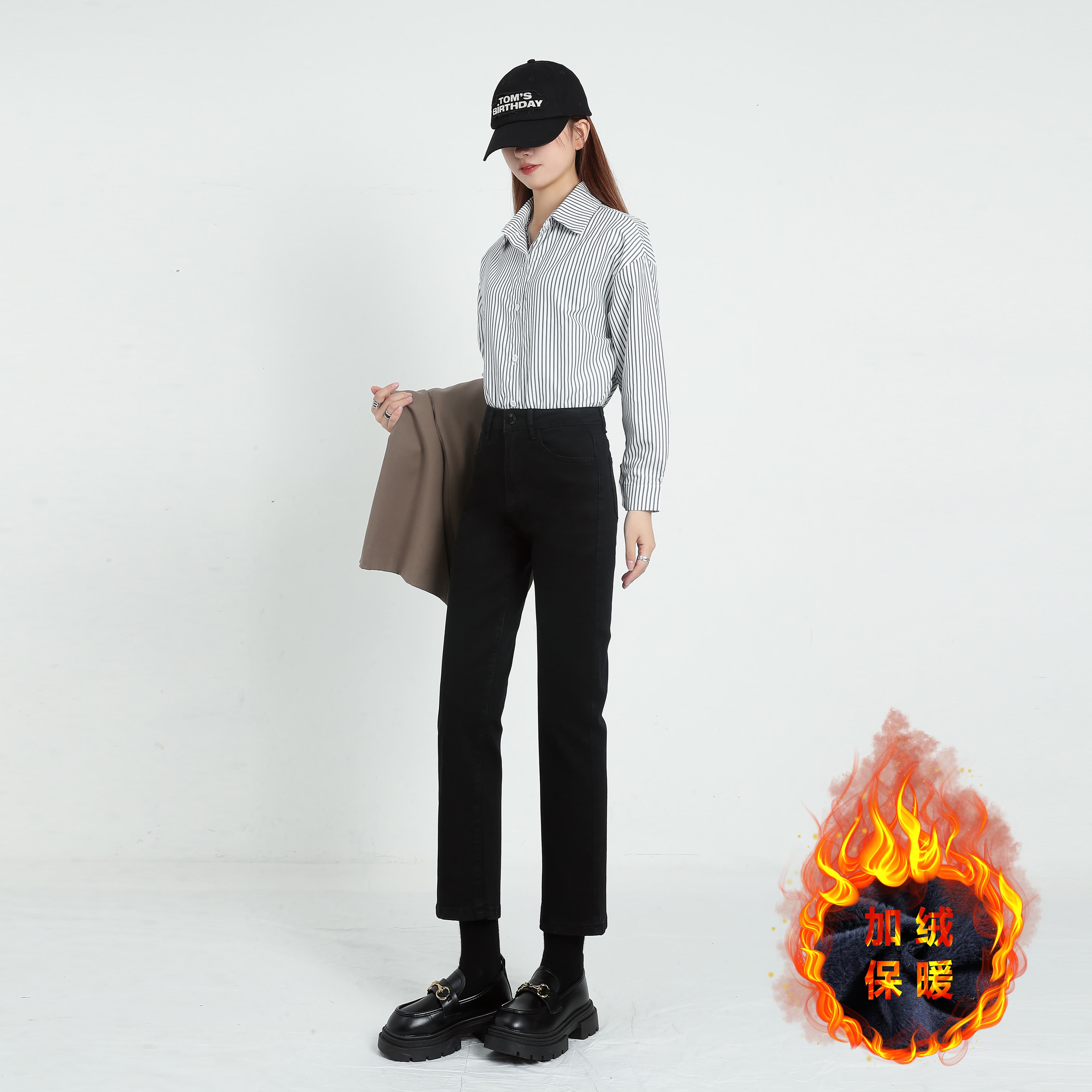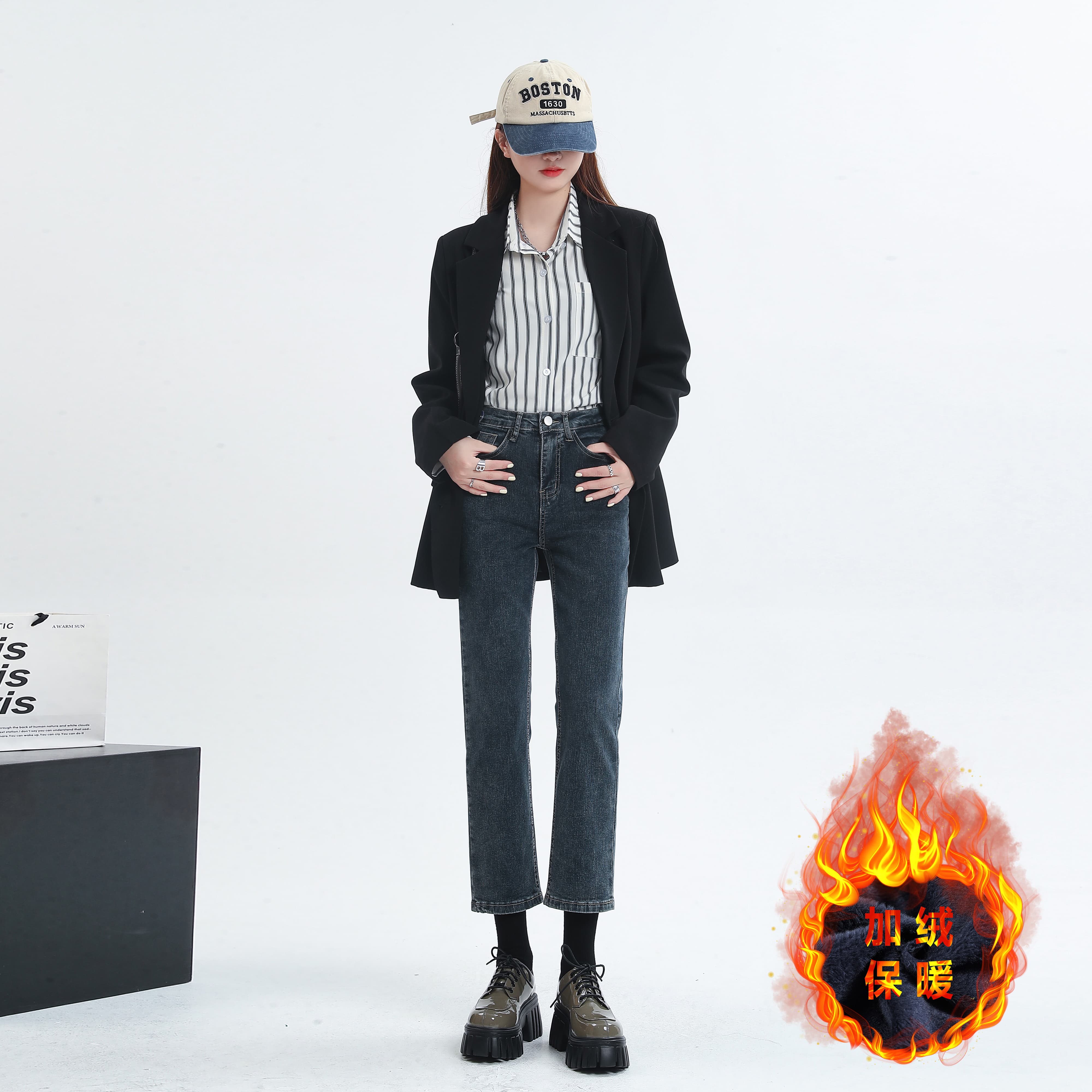 TKBJR881女新款秋冬加绒加厚牛仔裤直筒裤高腰显瘦弹力紧身烟管裤