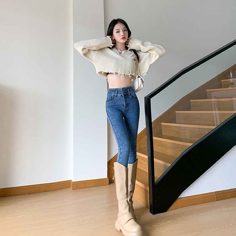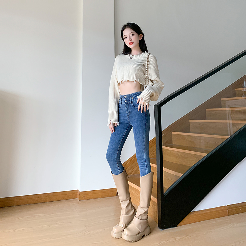 SGGJR2277辣妹百搭神裤紧身显瘦提臀小脚弹力铅笔裤加绒保暖牛仔裤