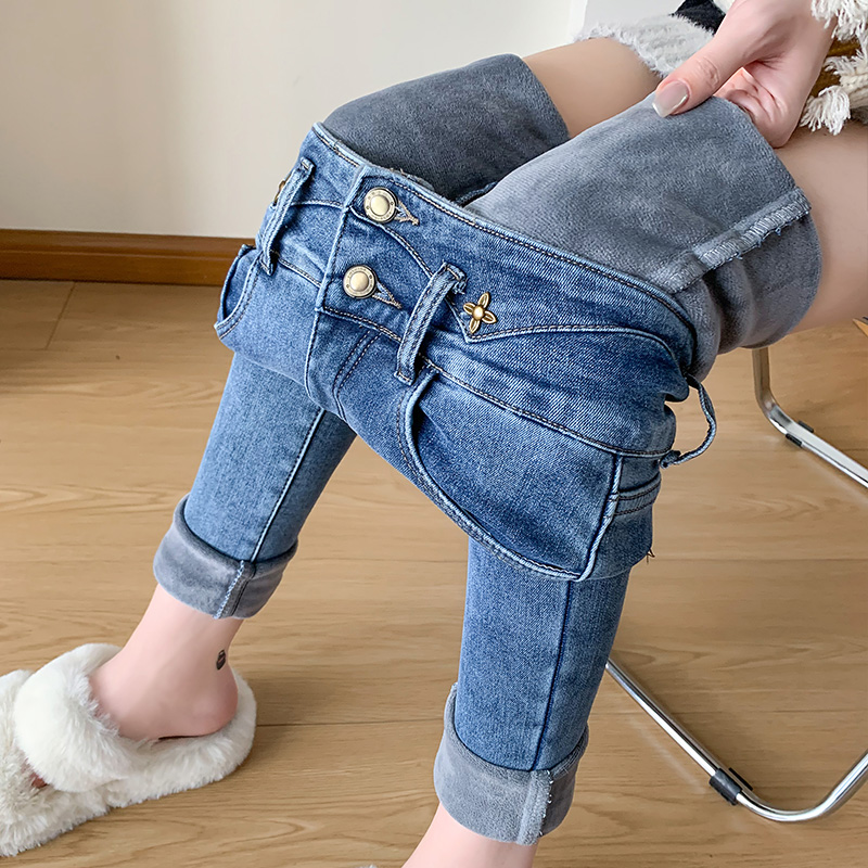 HSJR813女秋冬常规加绒加厚高腰弹力修身小脚裤牛仔裤
