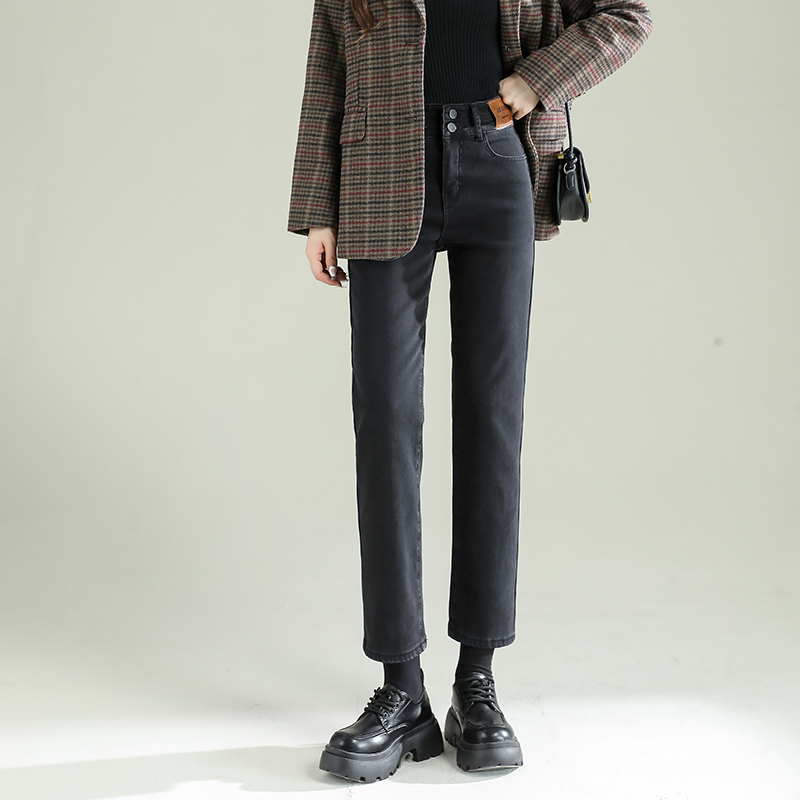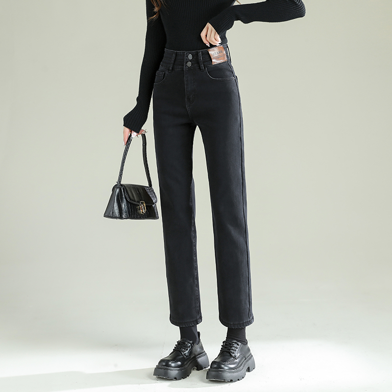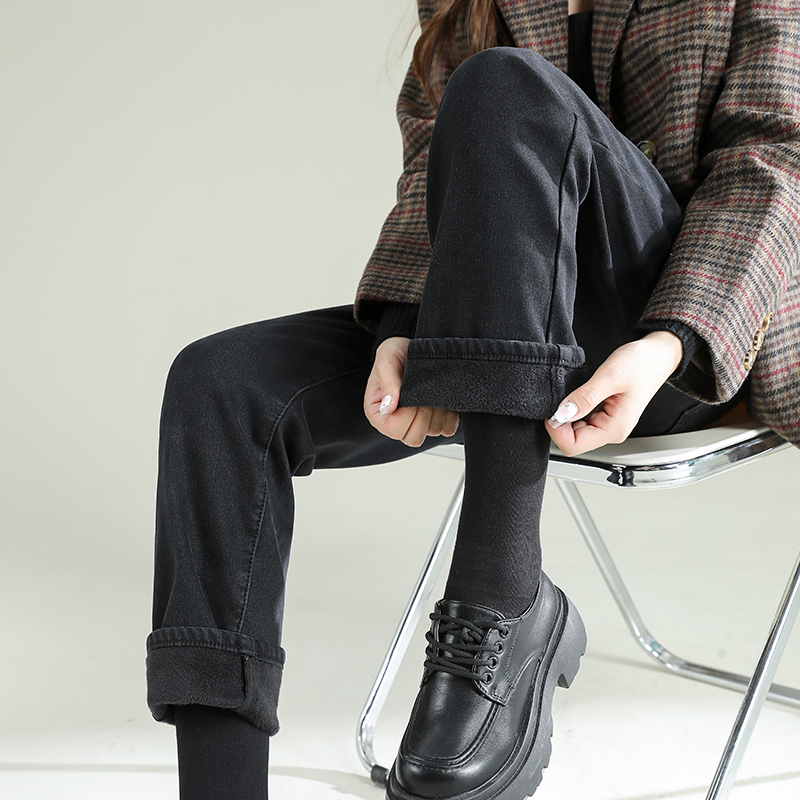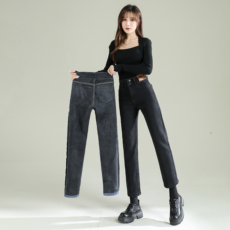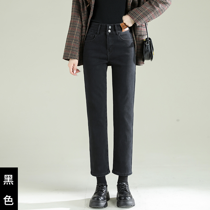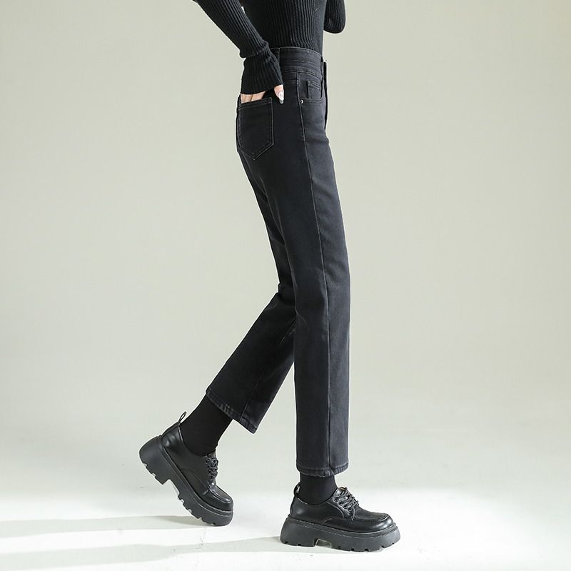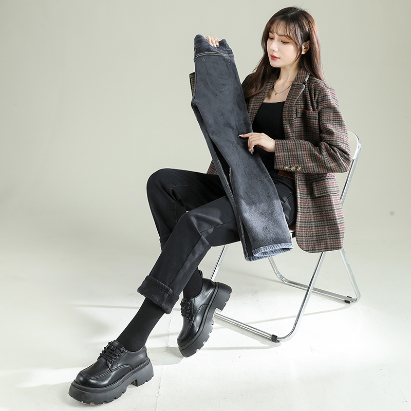 TKBJR881女新款秋冬加绒加厚牛仔裤直筒裤高腰显瘦弹力紧身烟管裤