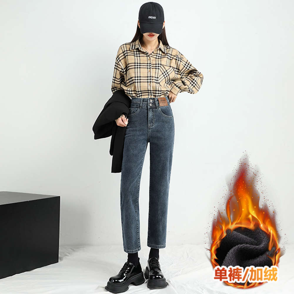 TKBJR889直筒牛仔裤女秋冬新款显瘦宽松高腰加绒厚烟管裤
