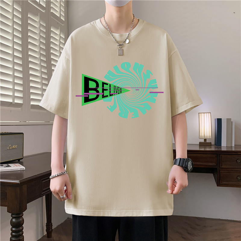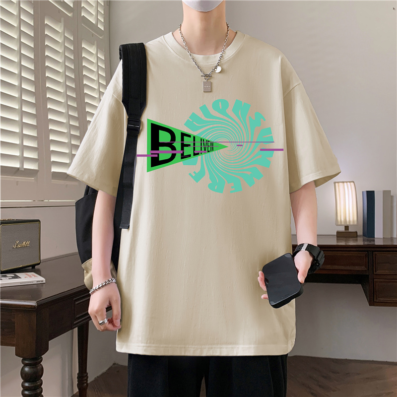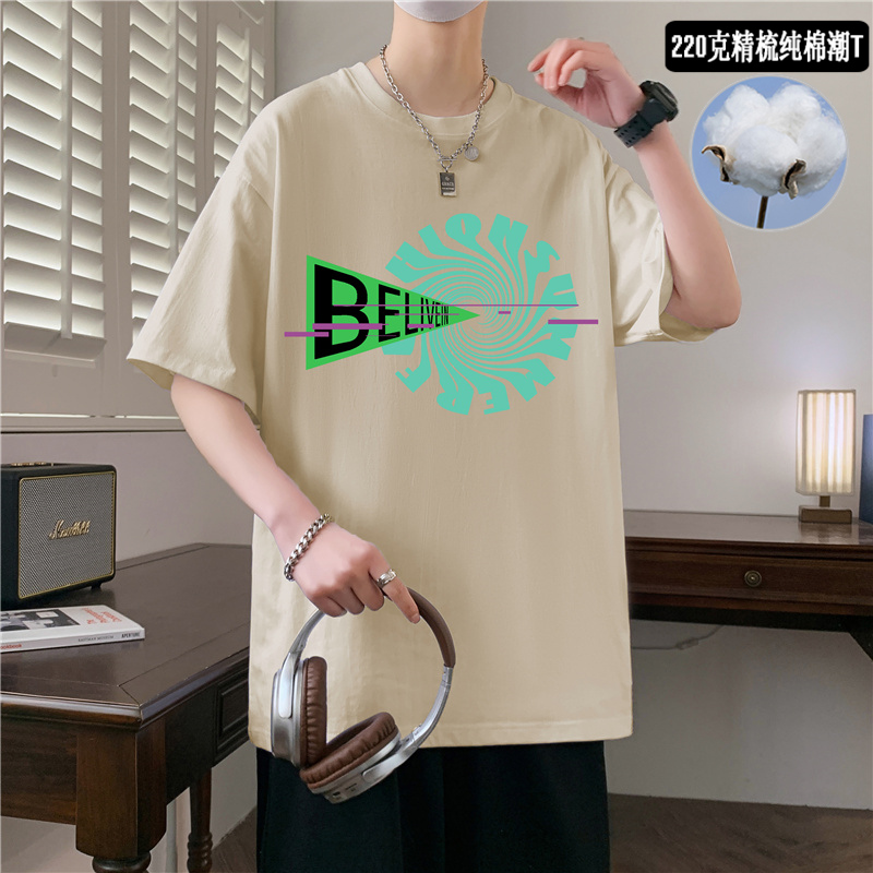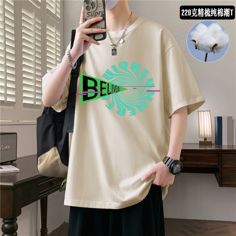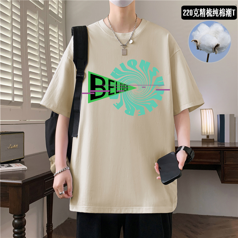 60090新款高品质纯棉T恤220克重磅精梳棉宽松落肩款圆形旋风-模特图 S 杏色