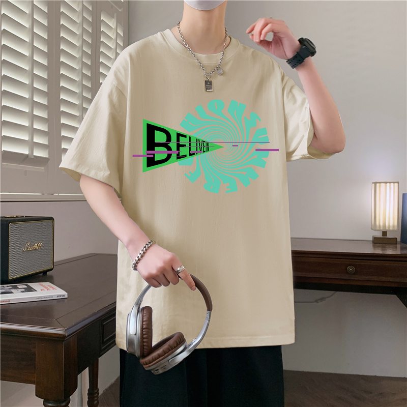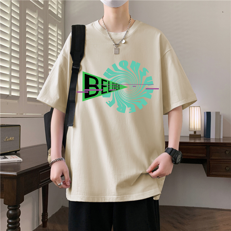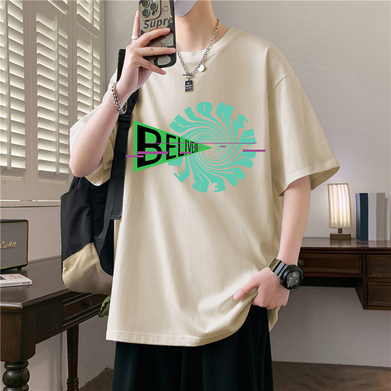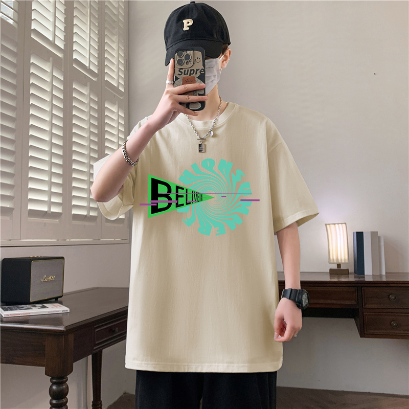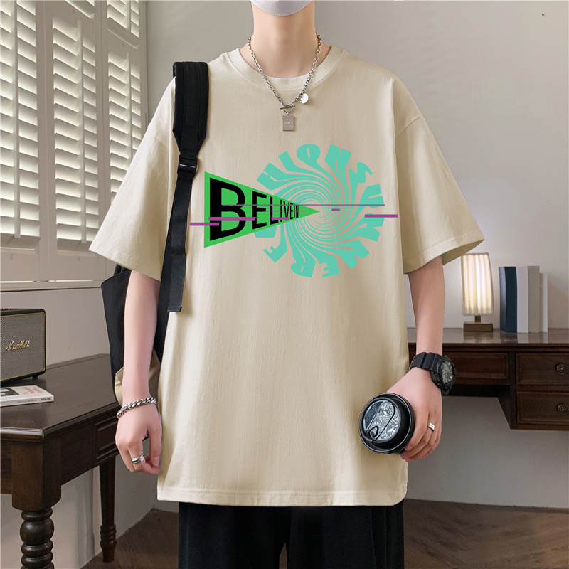 60090新款高品质纯棉T恤220克重磅精梳棉宽松落肩款圆形旋风-模特图 S 杏色