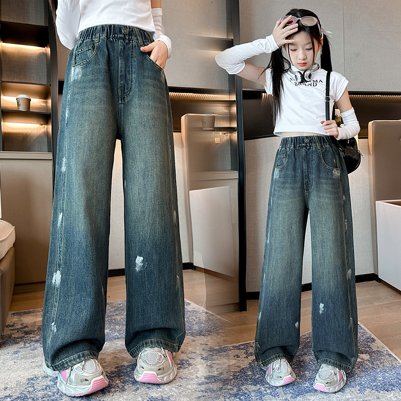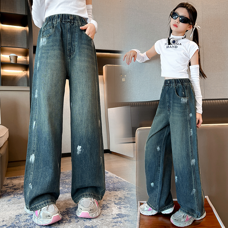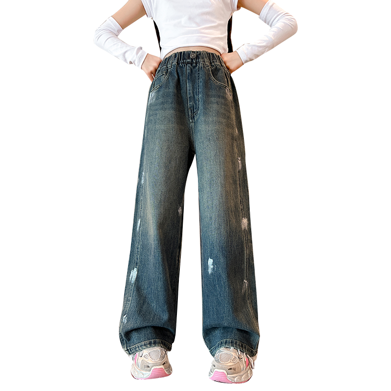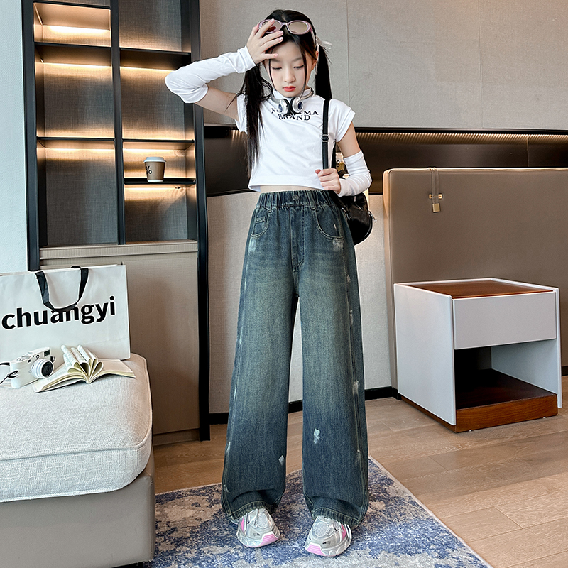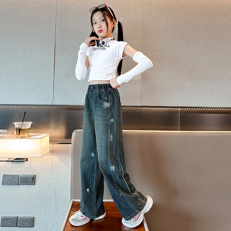 唯爱琪-2扣牛仔阔腿裤女中大童装休闲直筒百搭新款