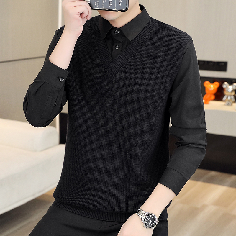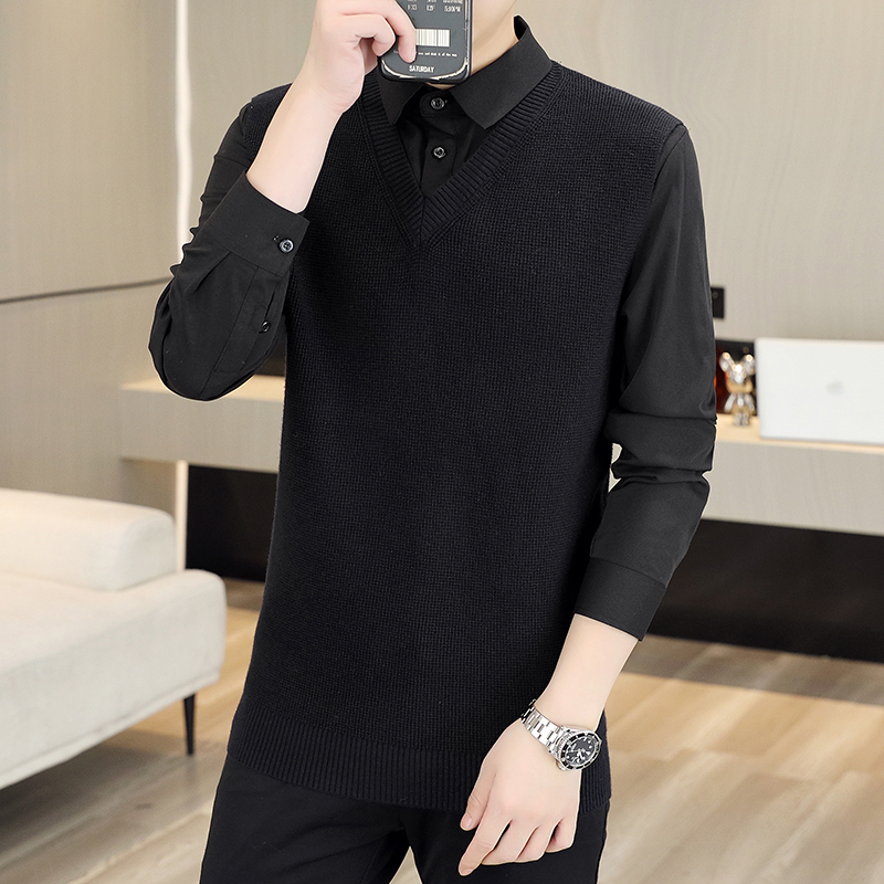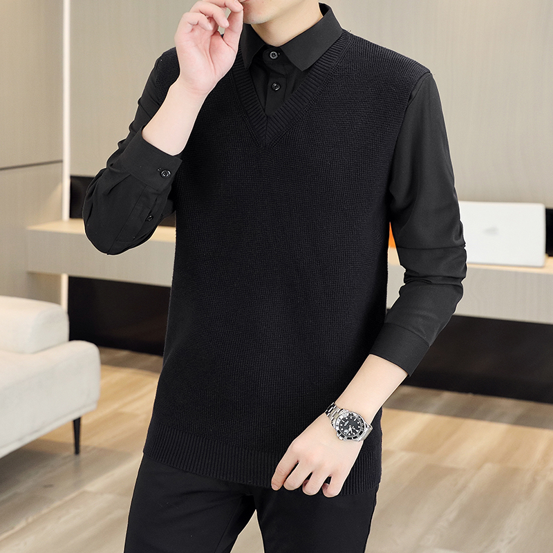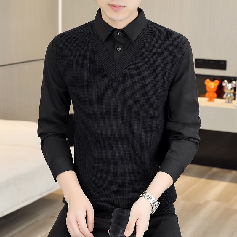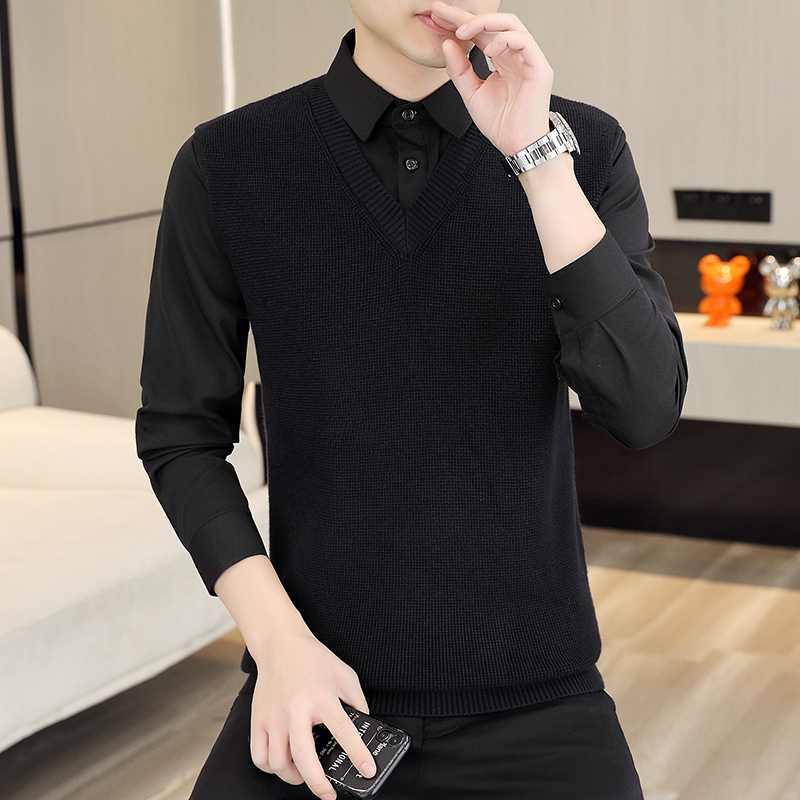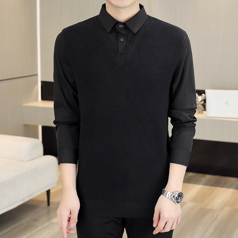 KY38新款时尚潮流衬衫领假两件毛衣 M 黑色