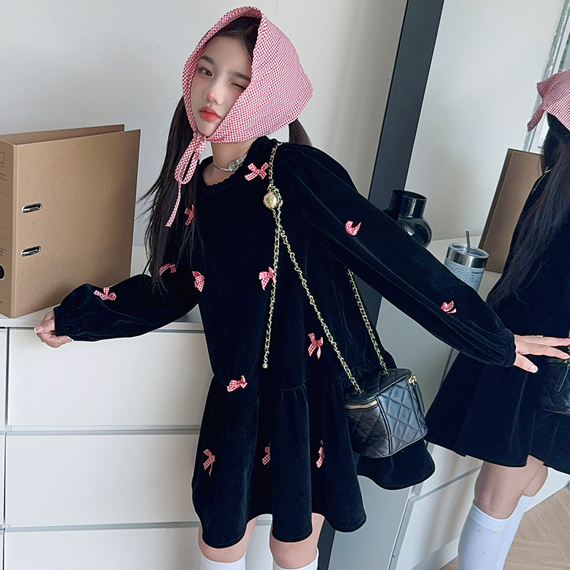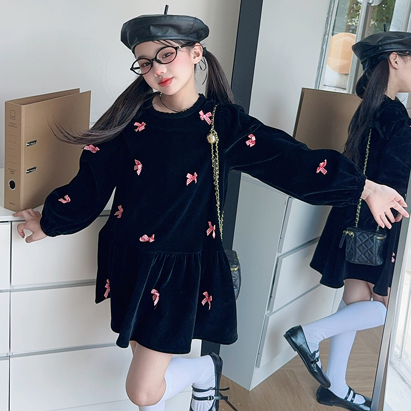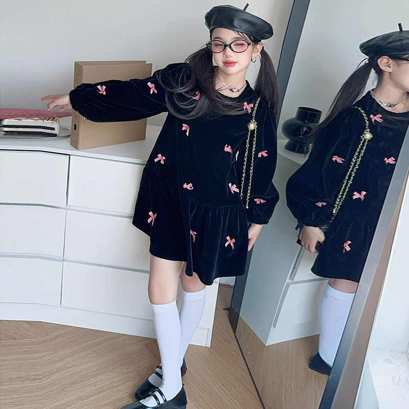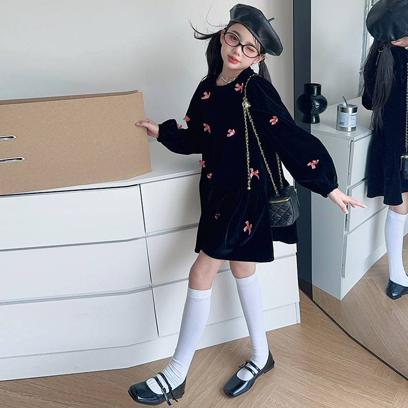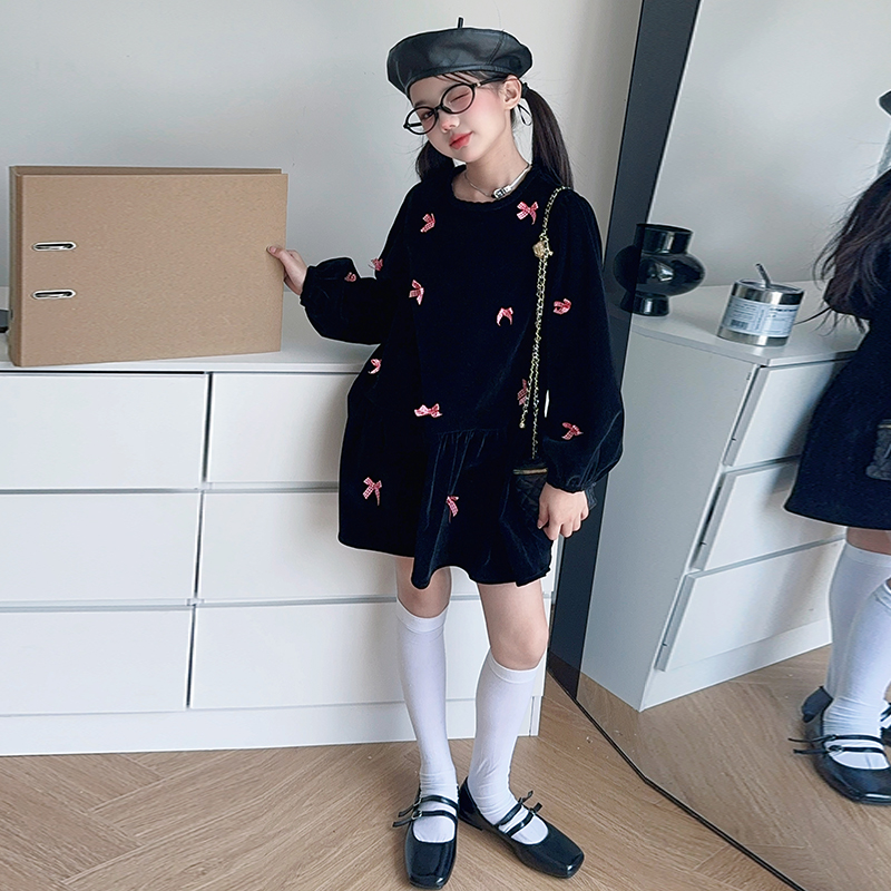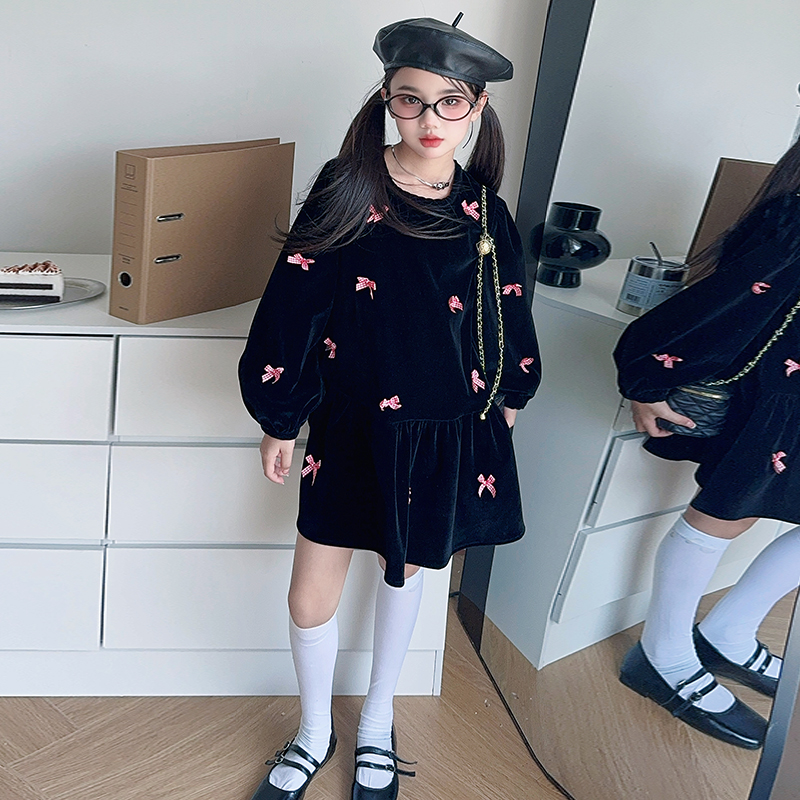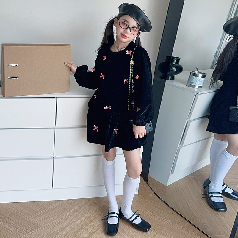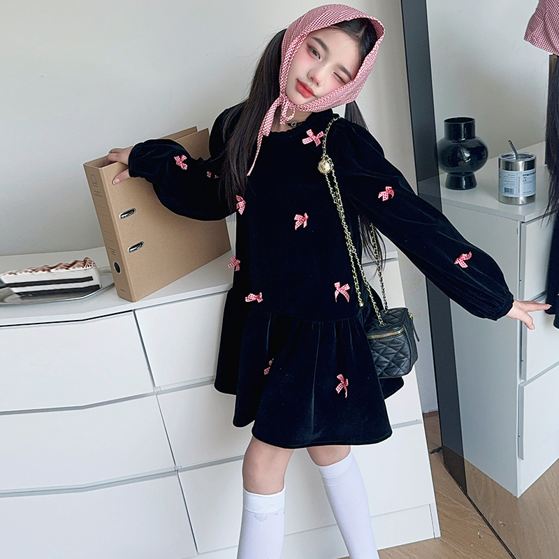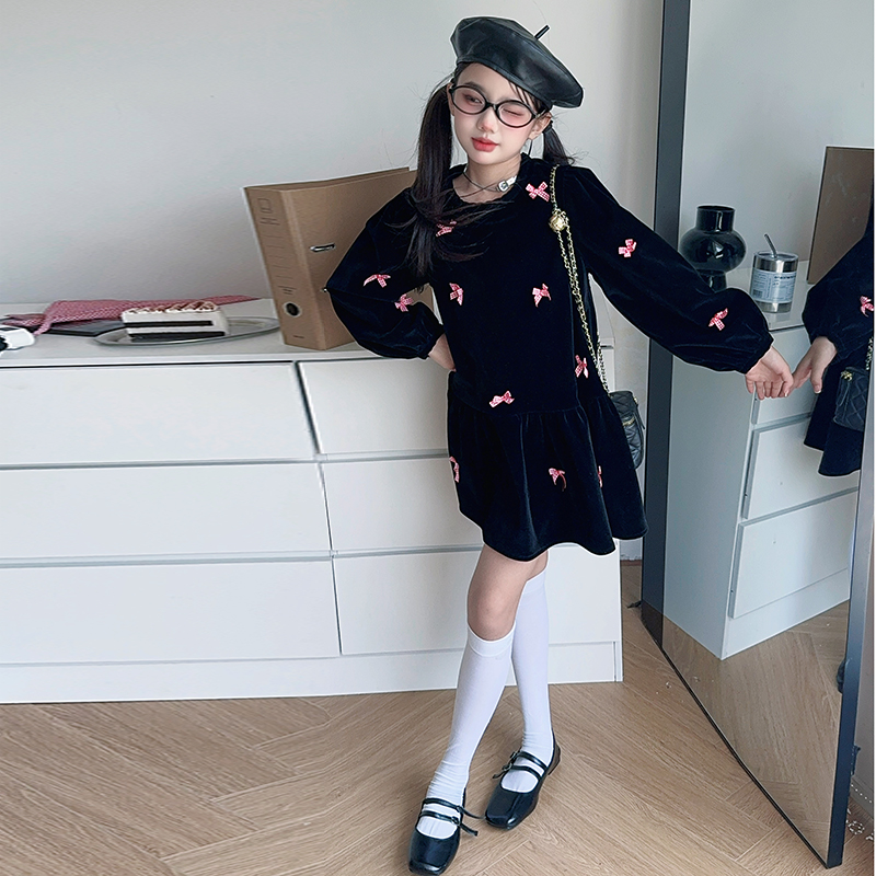 雅琪(原柒号童装)-蝴蝶结黑色丝绒连衣裙