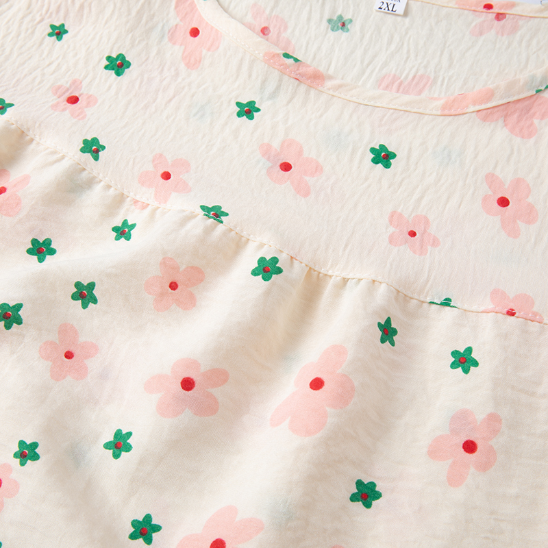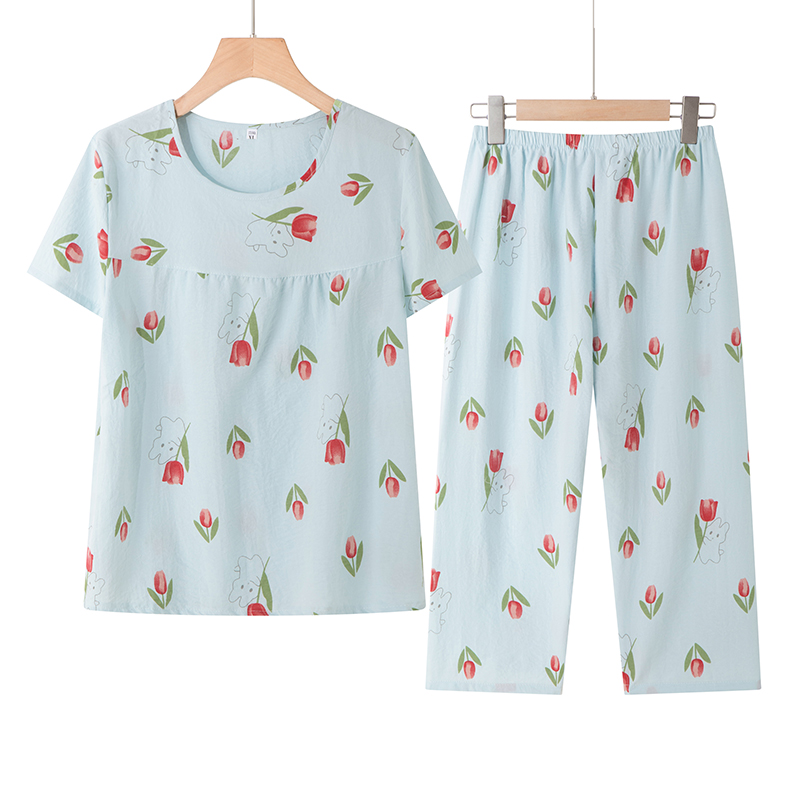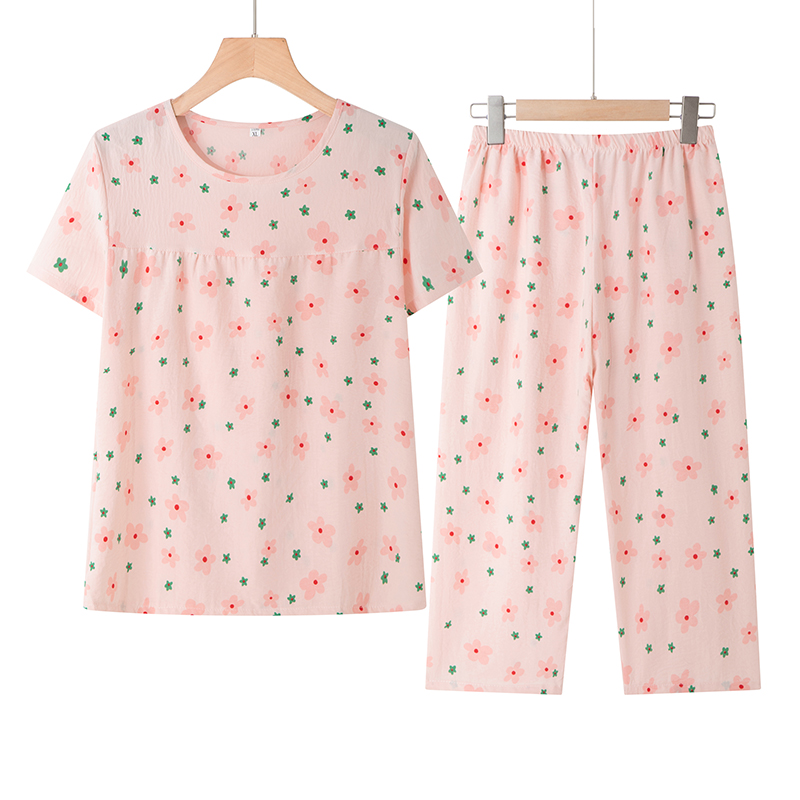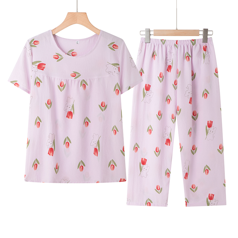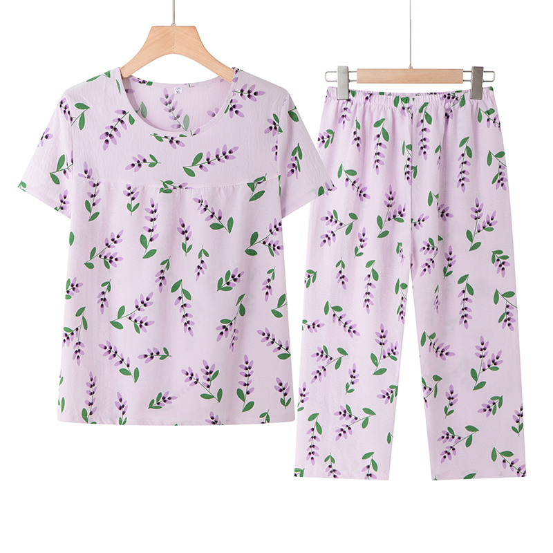 棉绸短袖长裤开衫套装-2305 XL 紫色花朵