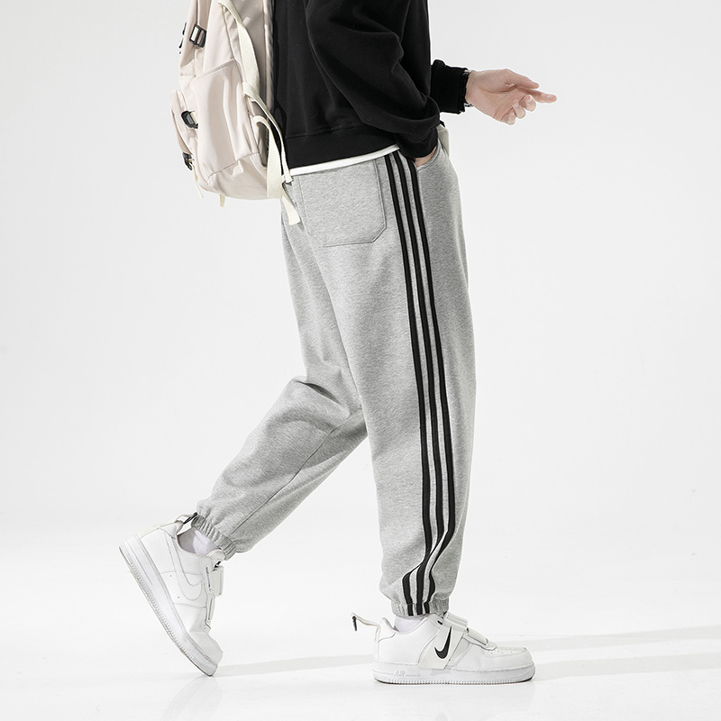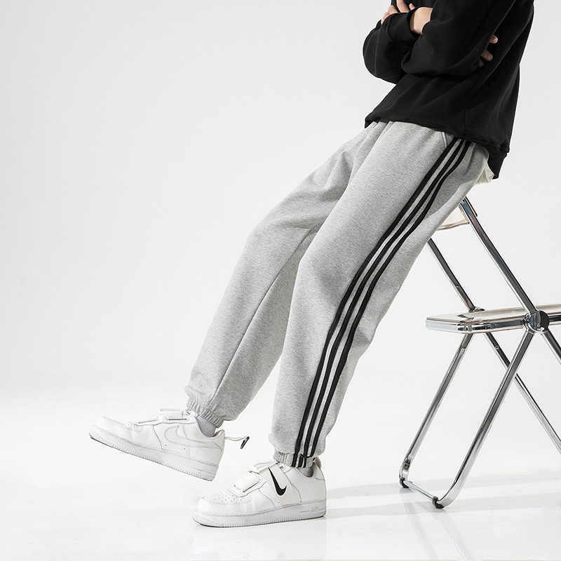 2025春秋新款三条杠针织束脚运动裤子男百搭潮流休闲裤男 S 浅灰色