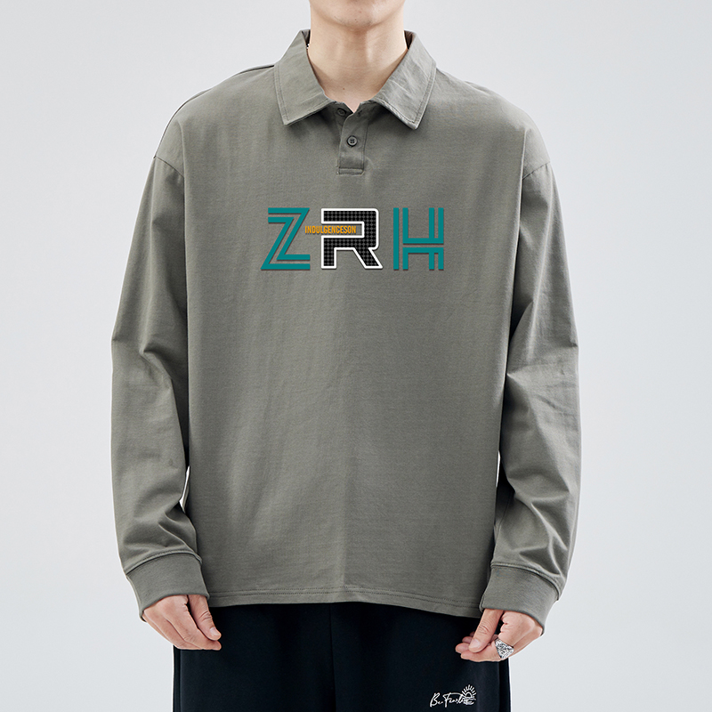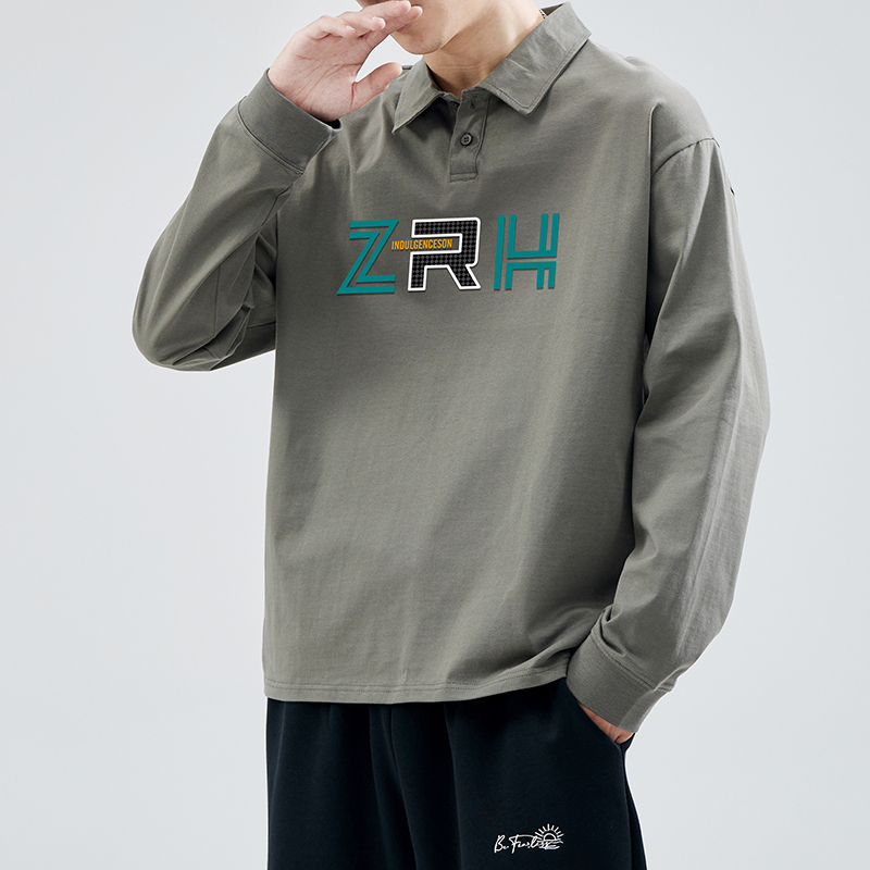 主推纯棉polo衫长袖男士秋季新款翻领高级感宽松透气潮牌T恤男装 4XL 灰色