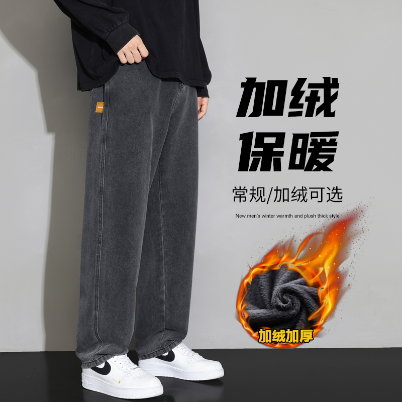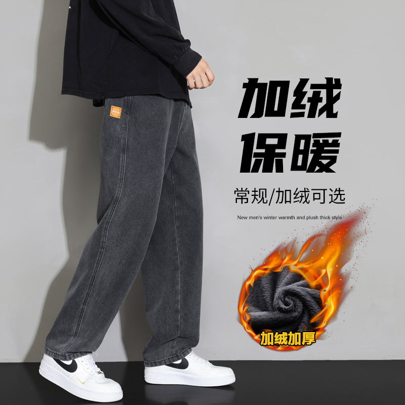 卡其色牛仔裤男款秋冬季美式宽松直筒水洗潮牌长裤子男士加绒加厚 S 黑色