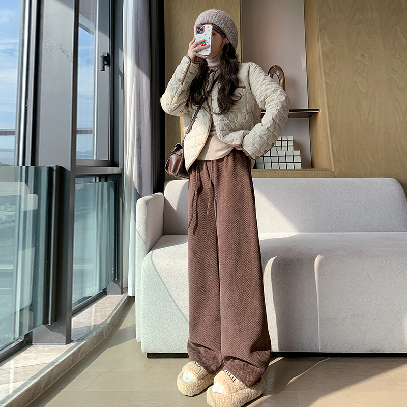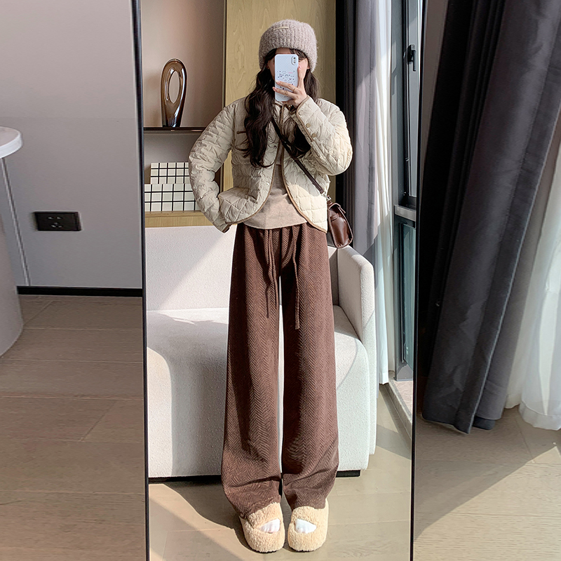 浅蓝人字纹阔腿裤女秋冬款高腰垂感直筒窄版运动雪尼尔加绒针织裤 S 2171 咖啡色