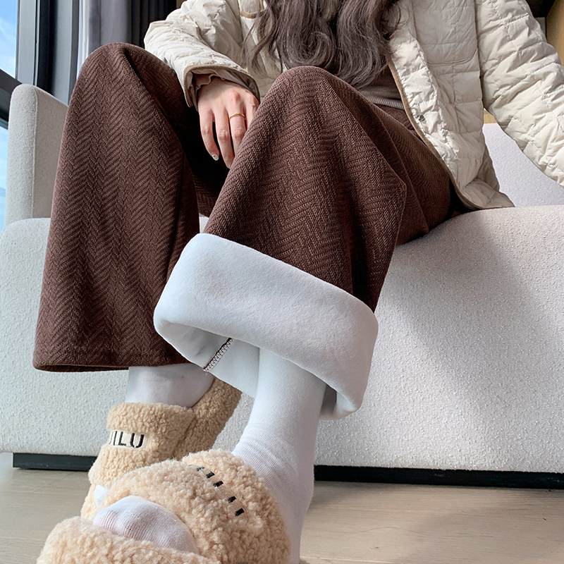 黑色人字纹阔腿裤女秋冬款高腰垂感直筒窄版运动雪尼尔加绒针织裤 S 2318 咖啡色加长羊羔绒