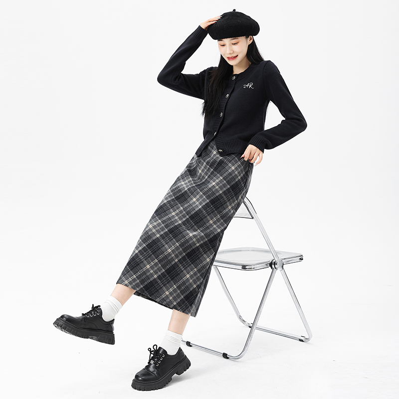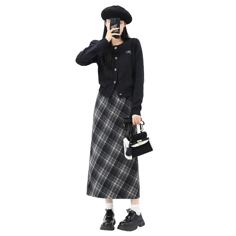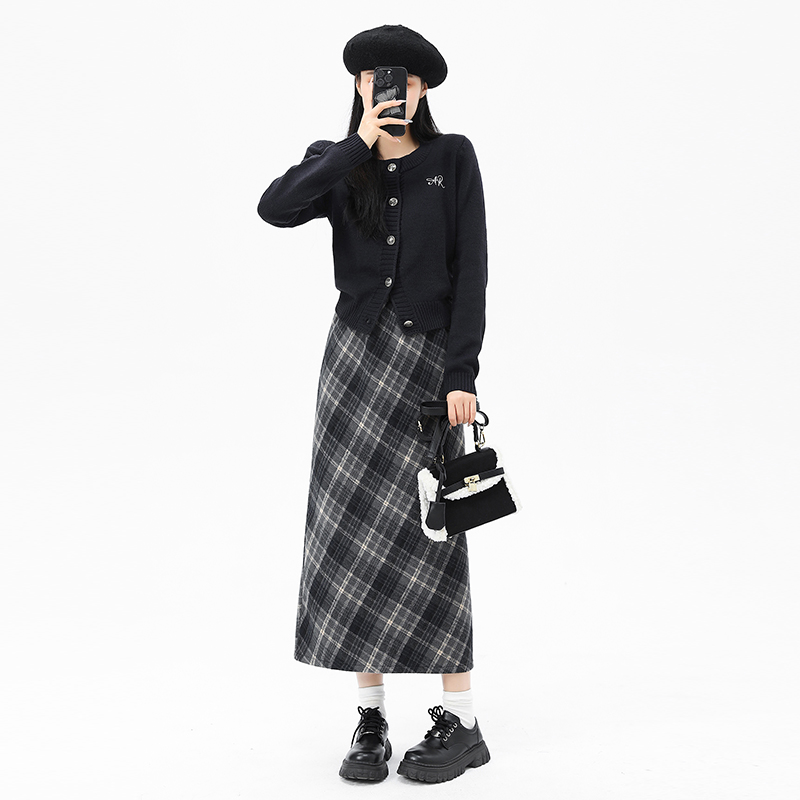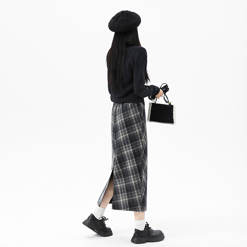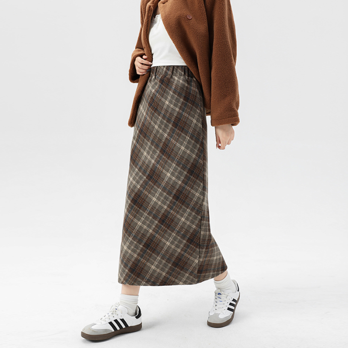 复古洋气格纹半身裙女新款胖mm大码显瘦高腰时尚气质毛呢遮跨长裙