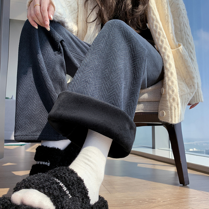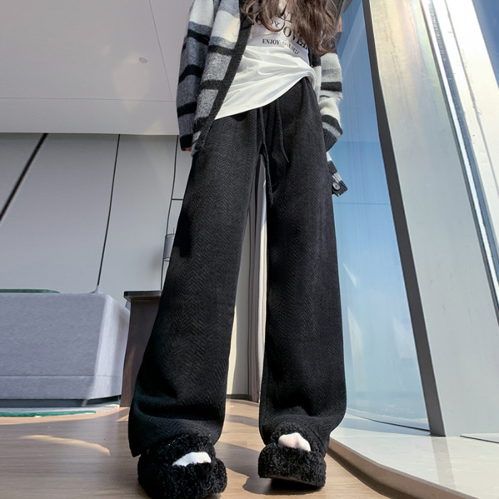 黑色人字纹阔腿裤女秋冬款高腰垂感直筒窄版运动雪尼尔加绒针织裤 S 2318 咖啡色加长羊羔绒