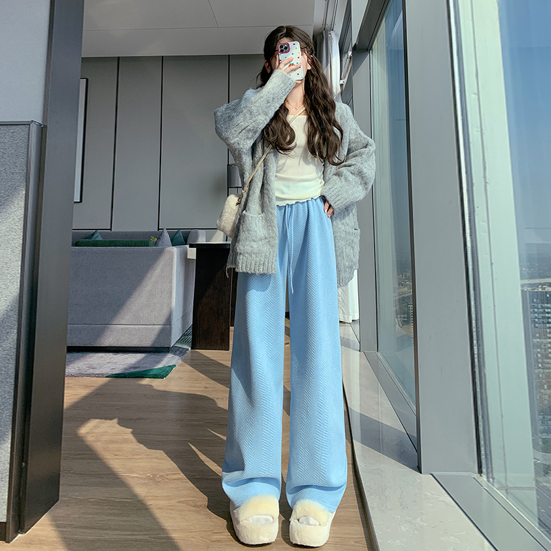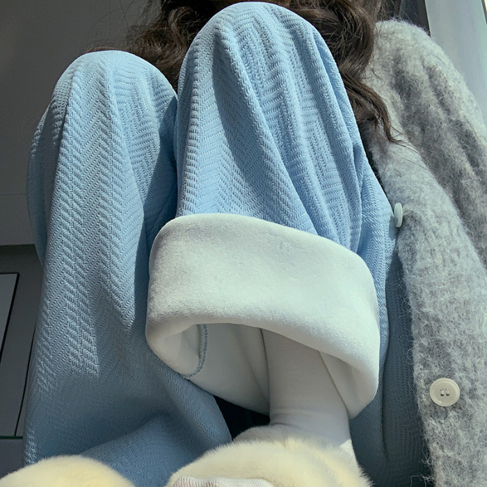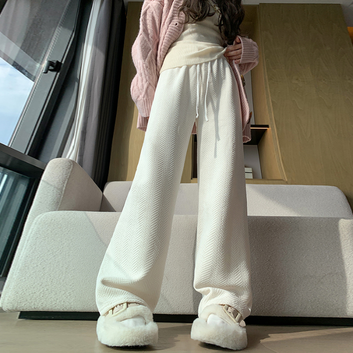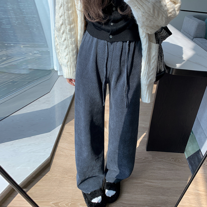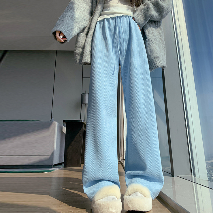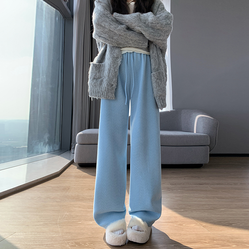 浅蓝人字纹阔腿裤女秋冬款高腰垂感直筒窄版运动雪尼尔加绒针织裤
