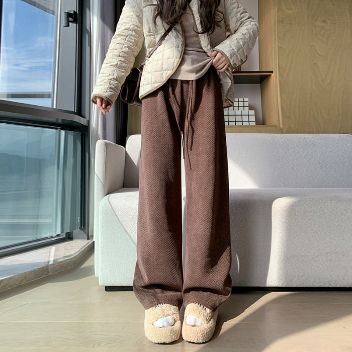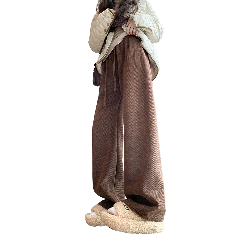 浅蓝人字纹阔腿裤女秋冬款高腰垂感直筒窄版运动雪尼尔加绒针织裤 S 2171 咖啡色