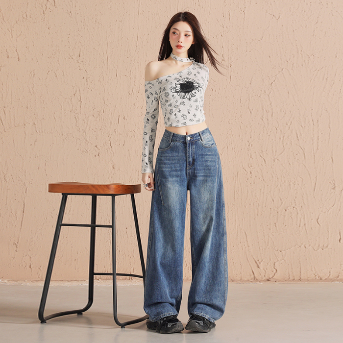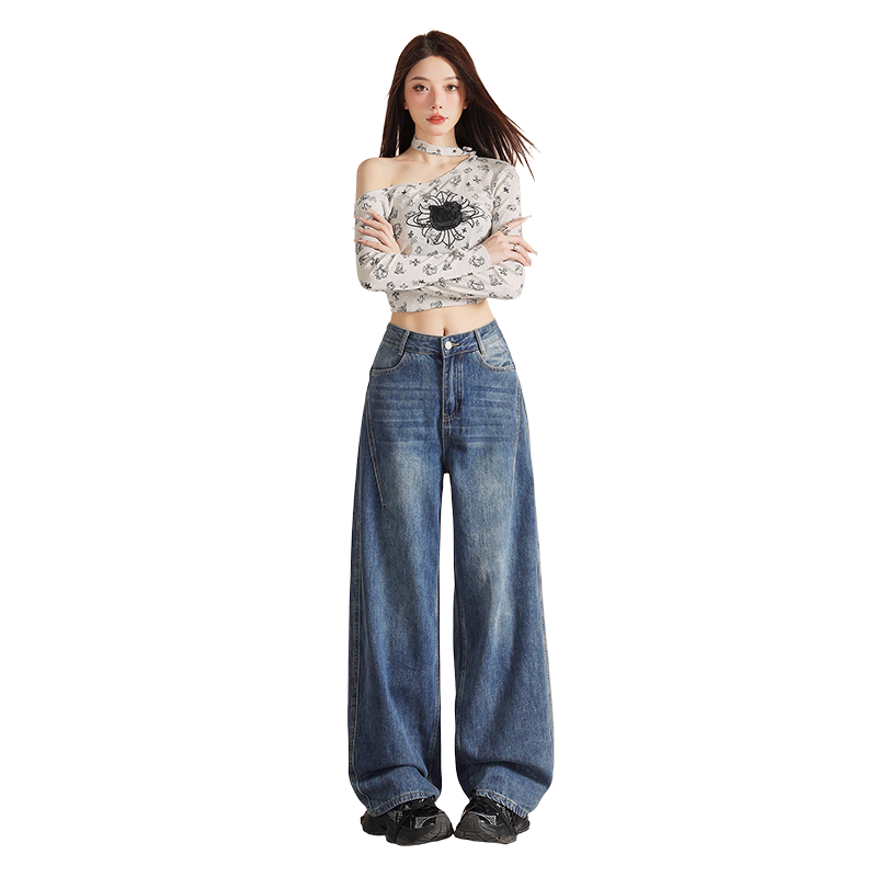 深蓝色阔腿牛仔裤女秋季新款美式辣妹高腰宽松垂感休闲拖地直筒裤3811 XS 蓝灰
