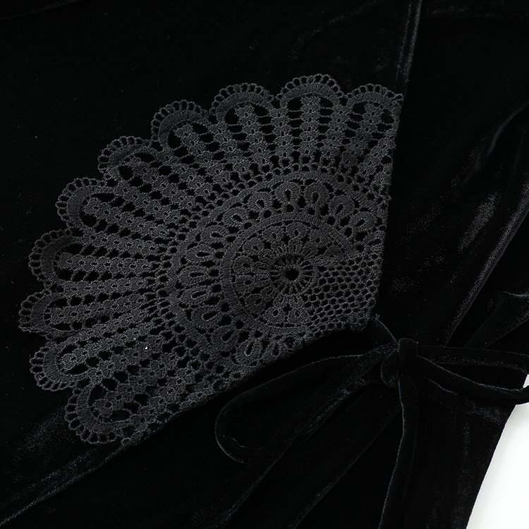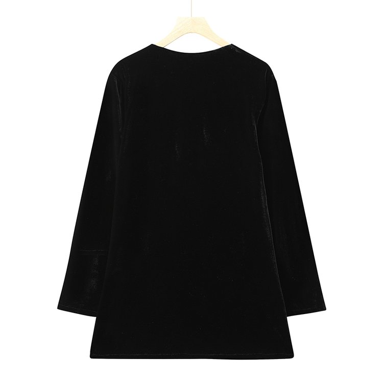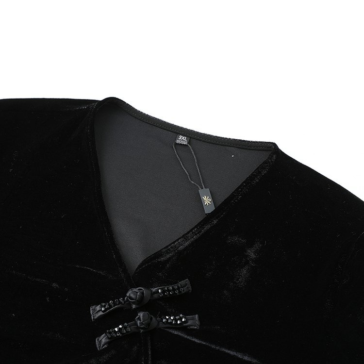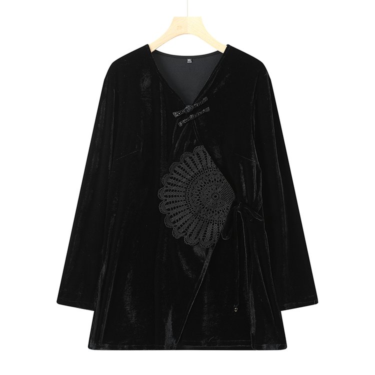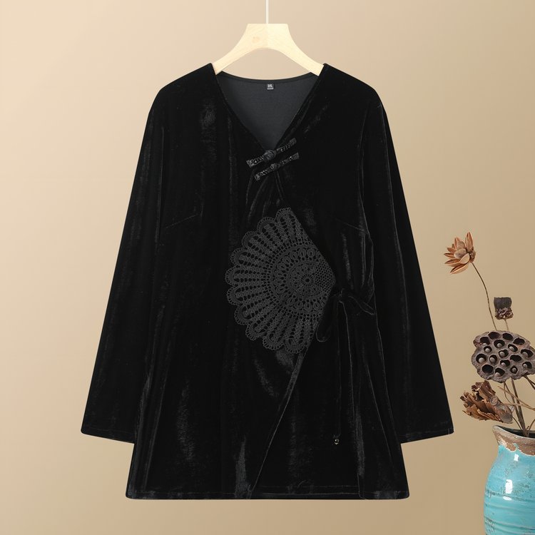 黑色丝绒中老年大码薄款上衣V领设计优雅蕾丝装饰显瘦T恤短袖春秋新款女性穿搭 XL 黑色