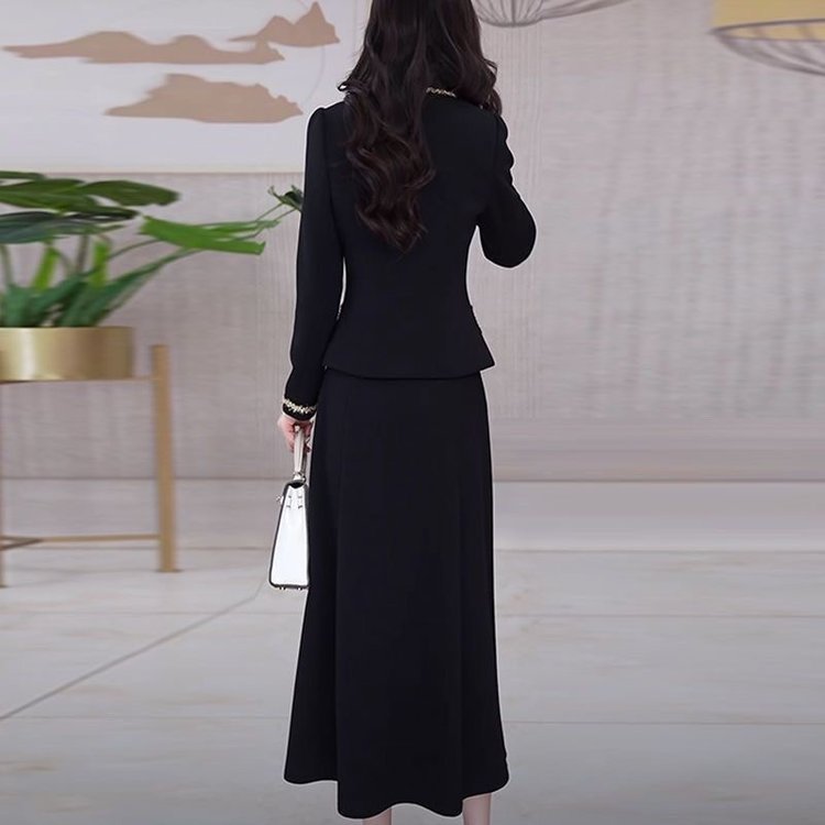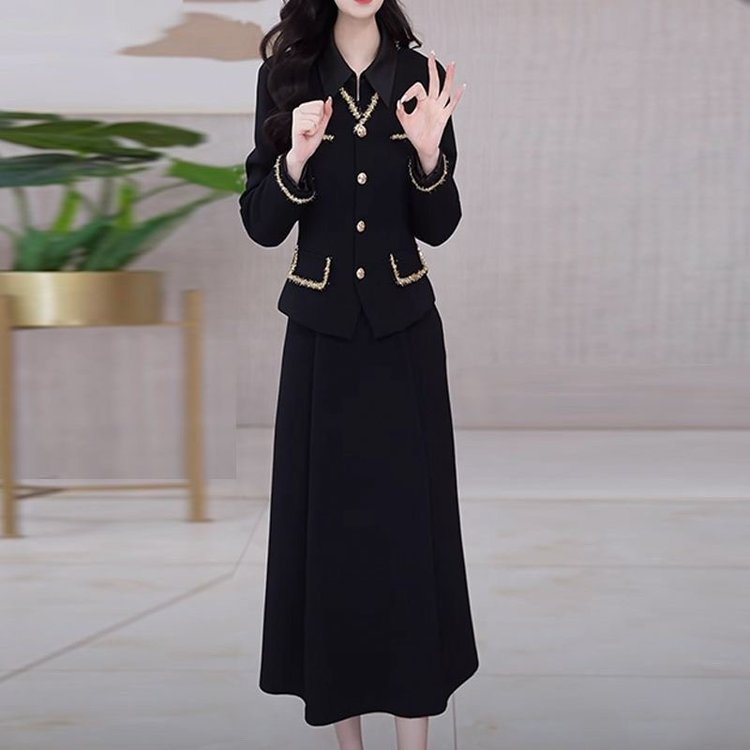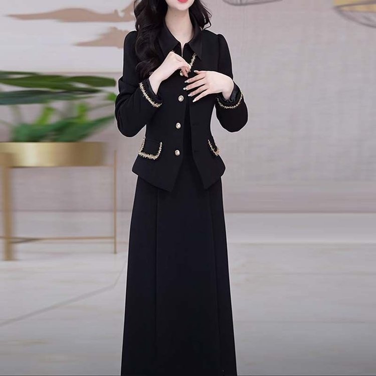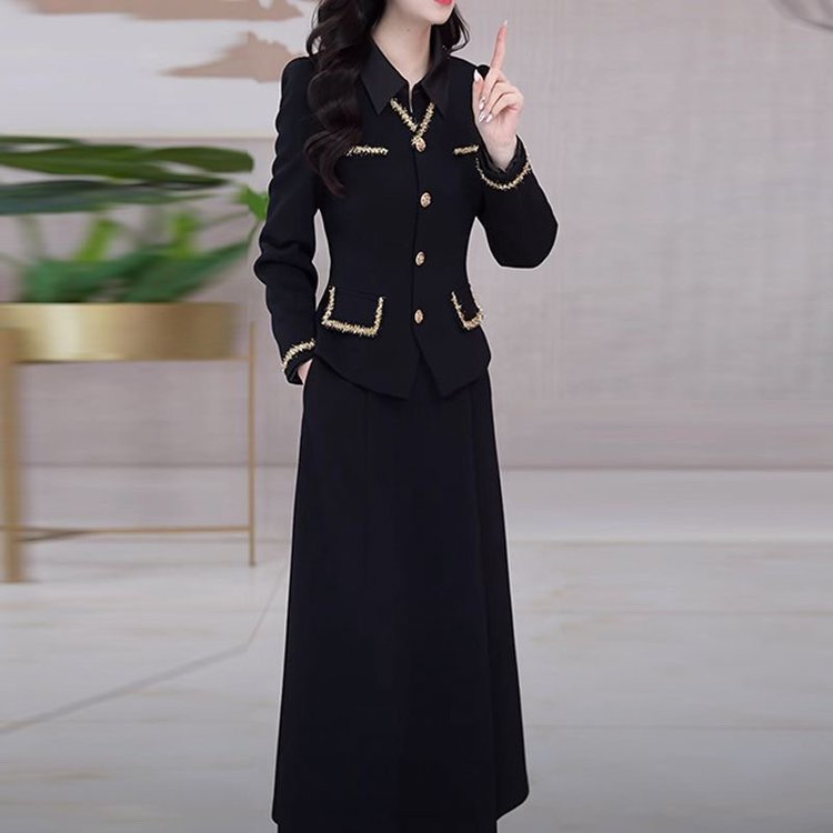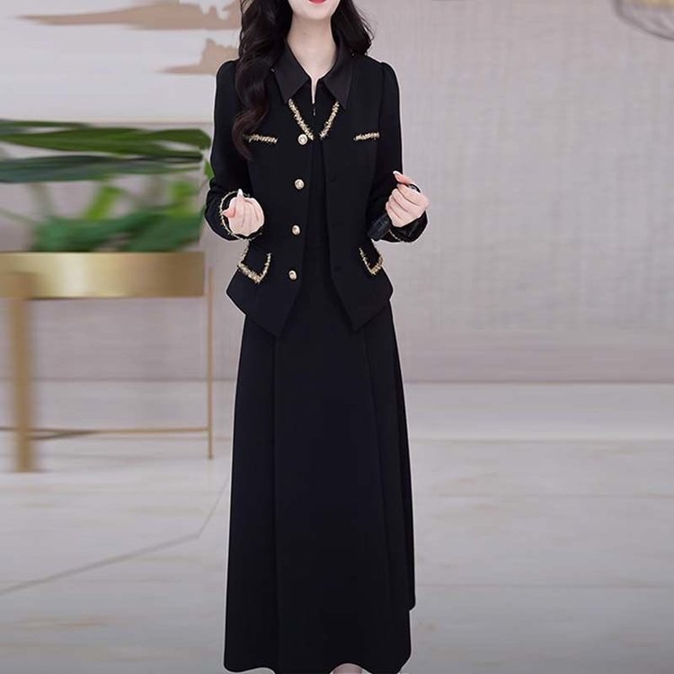 优雅中老年女士黑色长袖套装金边装饰显瘦设计春秋新款大码两件套 XL 黑色