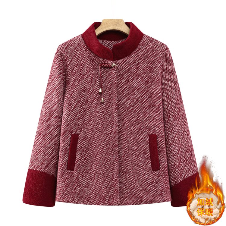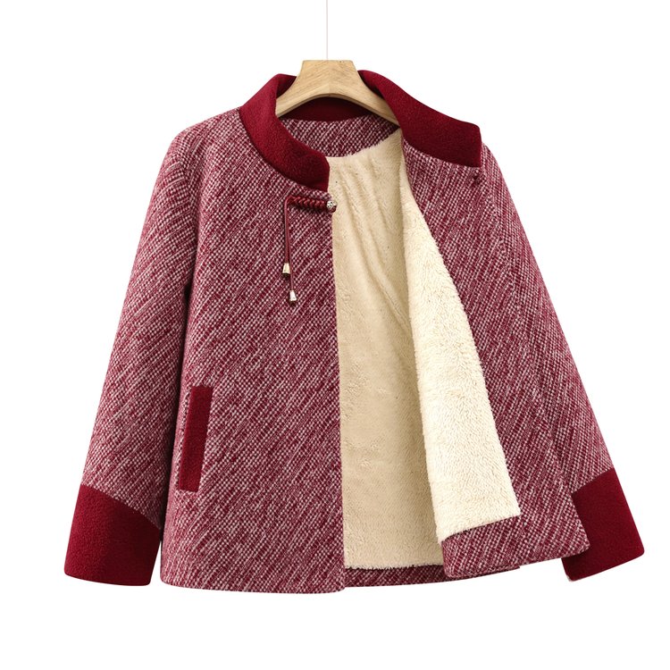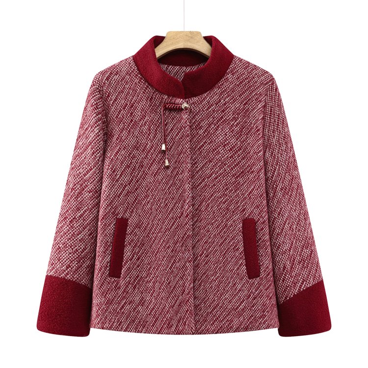 冬季中老年女士毛呢大衣加厚保暖仿羊羔绒领口设计外套 XL 红色