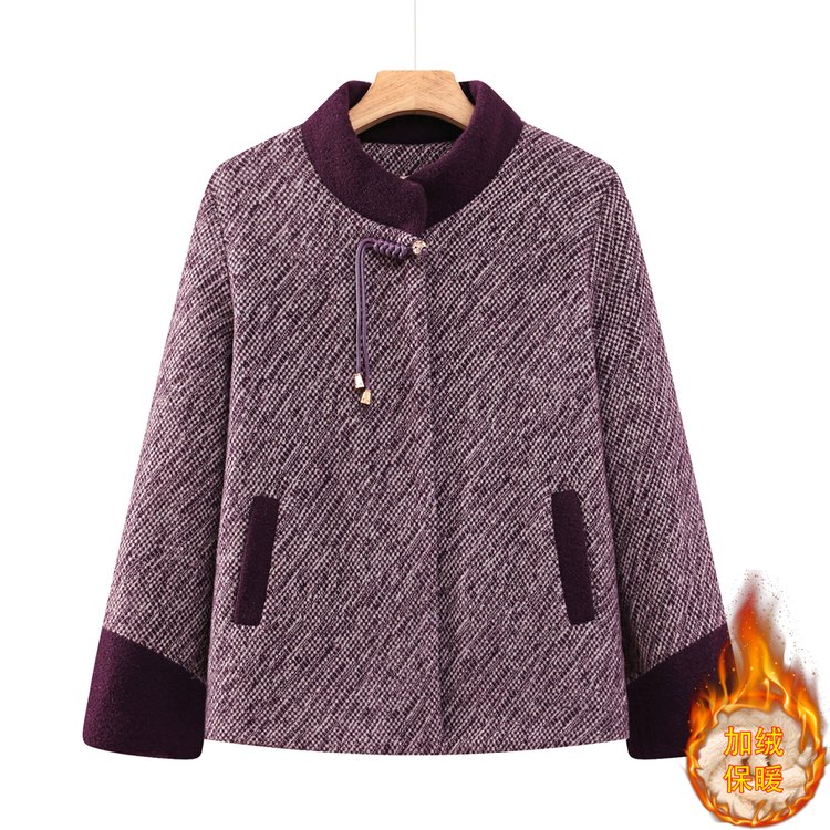 优雅女士秋冬加绒保暖紫色毛呢大衣中老年妈妈款外套 XL 粉紫色