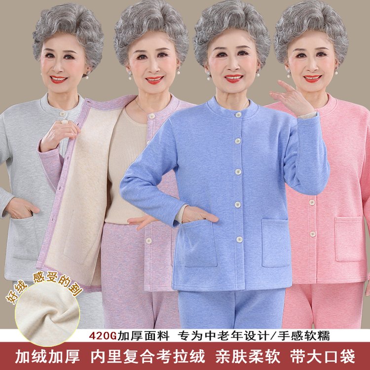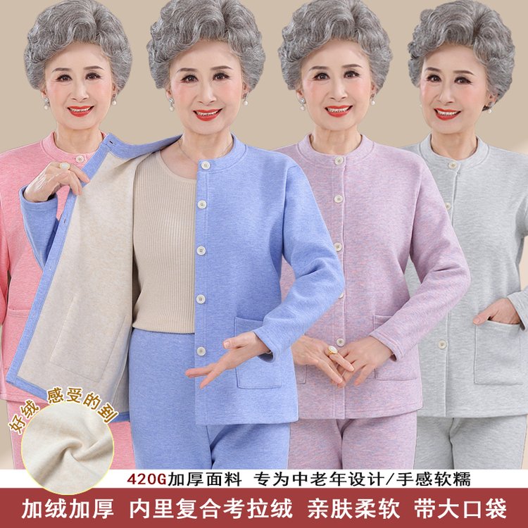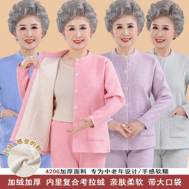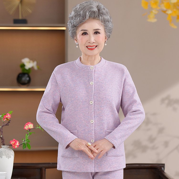 中老年女士套装加绒加厚内里复合拉绒亲肤柔软带大口袋四色可选420G面料 XL 浅紫(单件上衣)