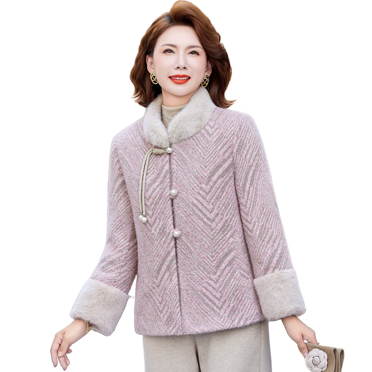 优雅女士秋冬加绒保暖紫色毛呢大衣中老年妈妈款外套 XL 粉紫色