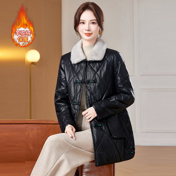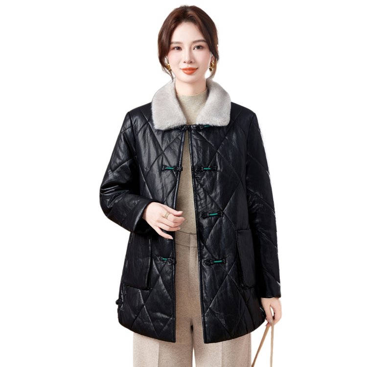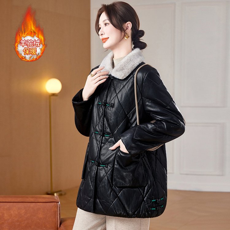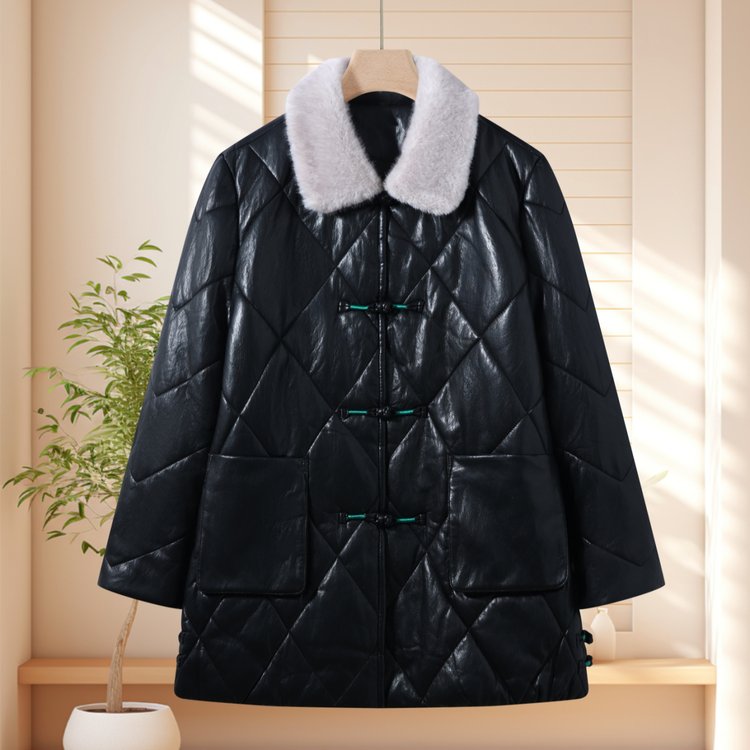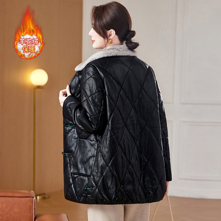 羊驼绒内衬保暖黑色皮质菱格纹中老年大码女装外套时尚百搭显瘦款 XL 黑色