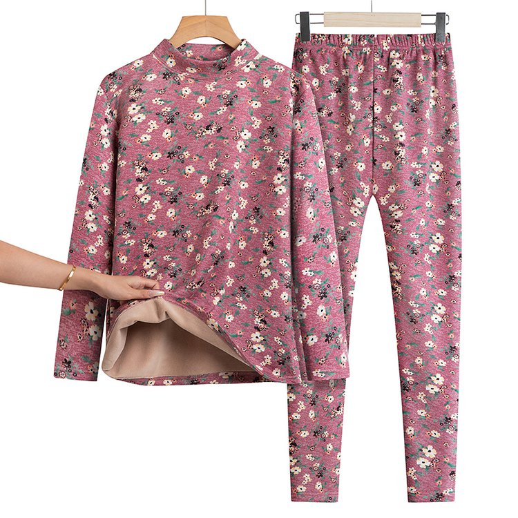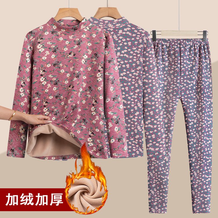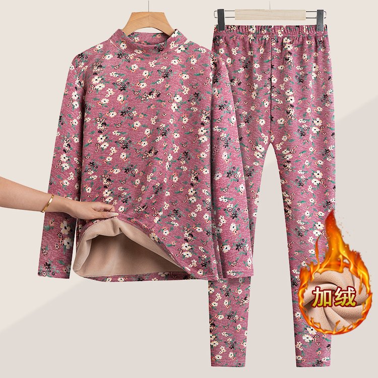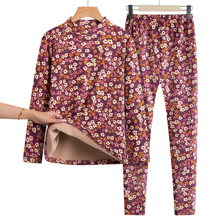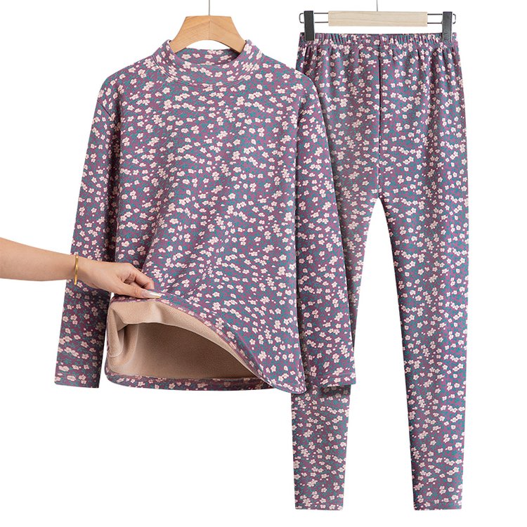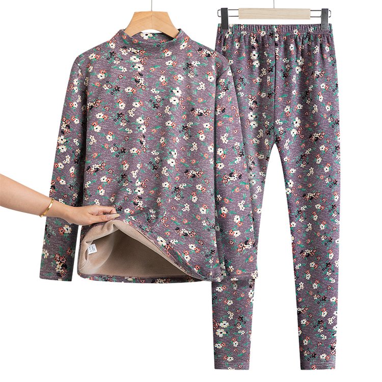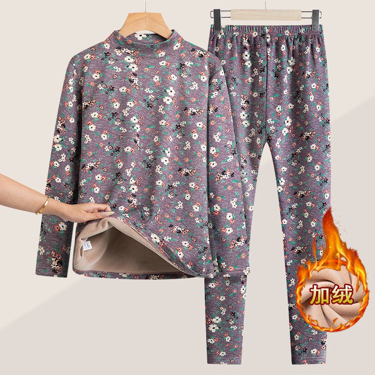 中老年女士冬季加绒保暖套装碎花长袖上衣裤子两件套大码舒适居家服 XL 灰紫(套装))