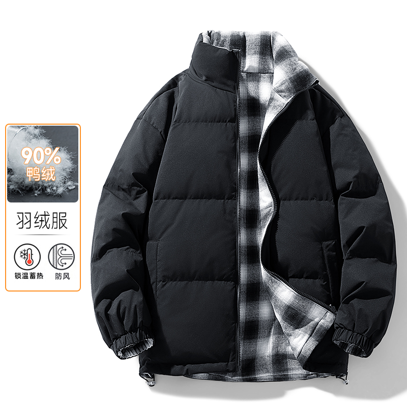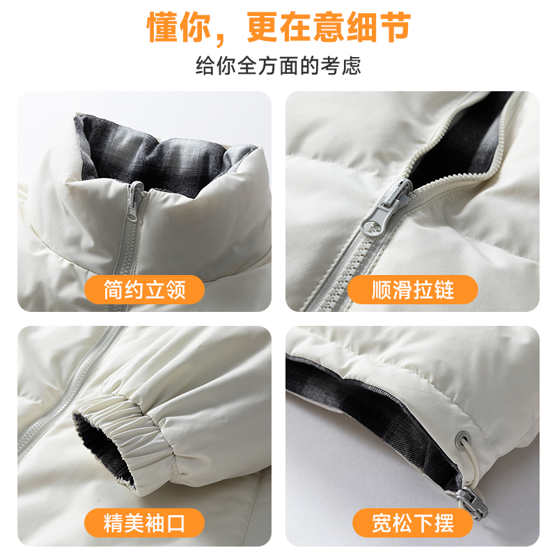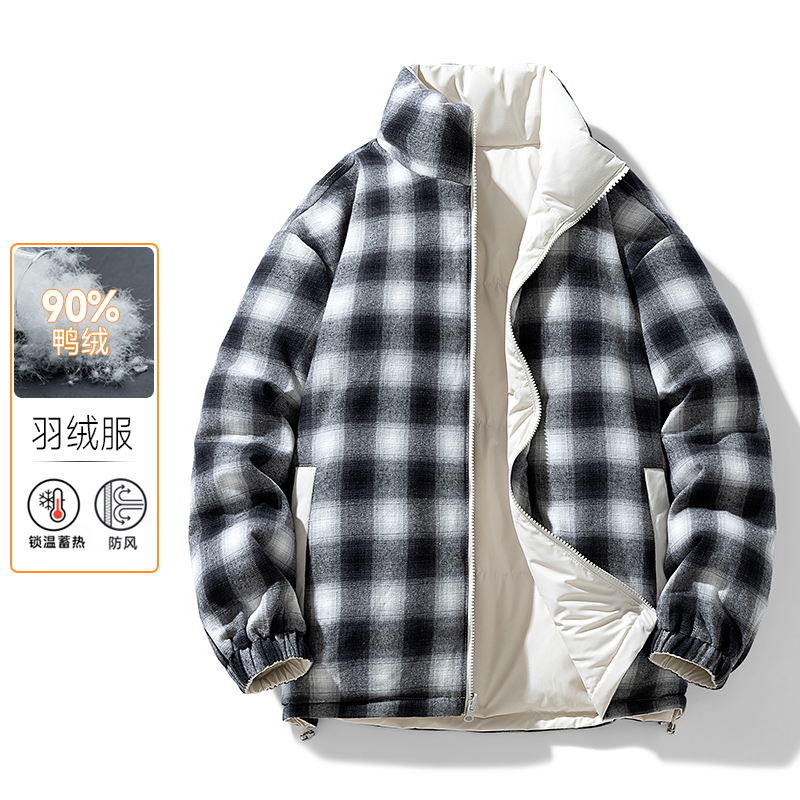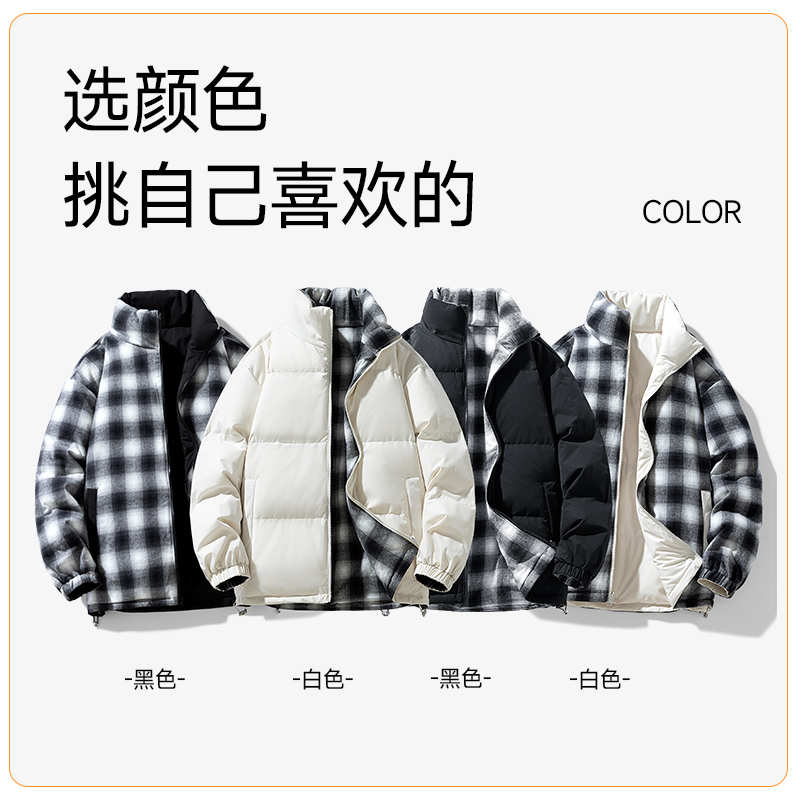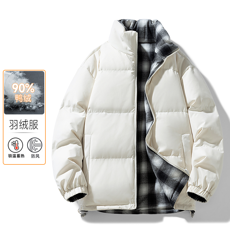 双面穿羽绒服情侣款大格子宽松立领面包服冬季男士加厚外套短款 M(90-120斤) 白色