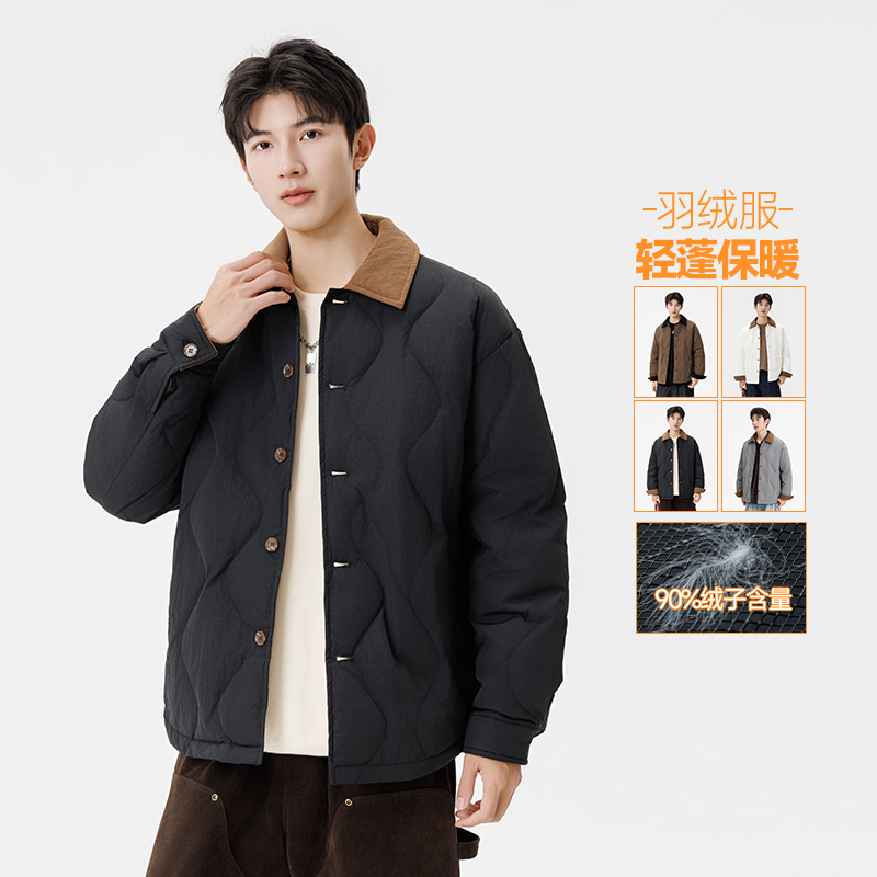 2025新款羽绒服薄款男士灯芯绒翻领保暖外套男女同款轻薄羽绒服 M 黑色