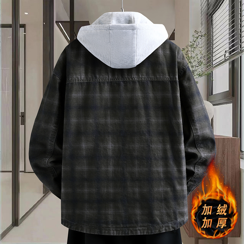 秋冬季新款格子牛仔外套男青少年学生港风夹克加绒加厚休闲褂子潮 M 黑色