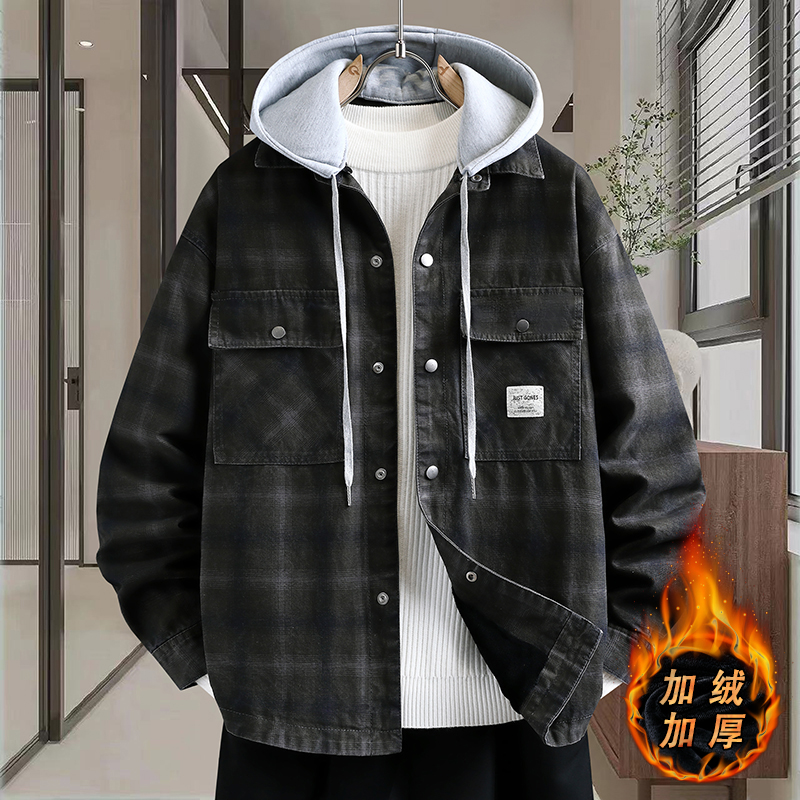 牛仔外套男冬季新款潮流加绒加厚痞帅宽松青少年连帽工装牛仔夹克 M 6637A款