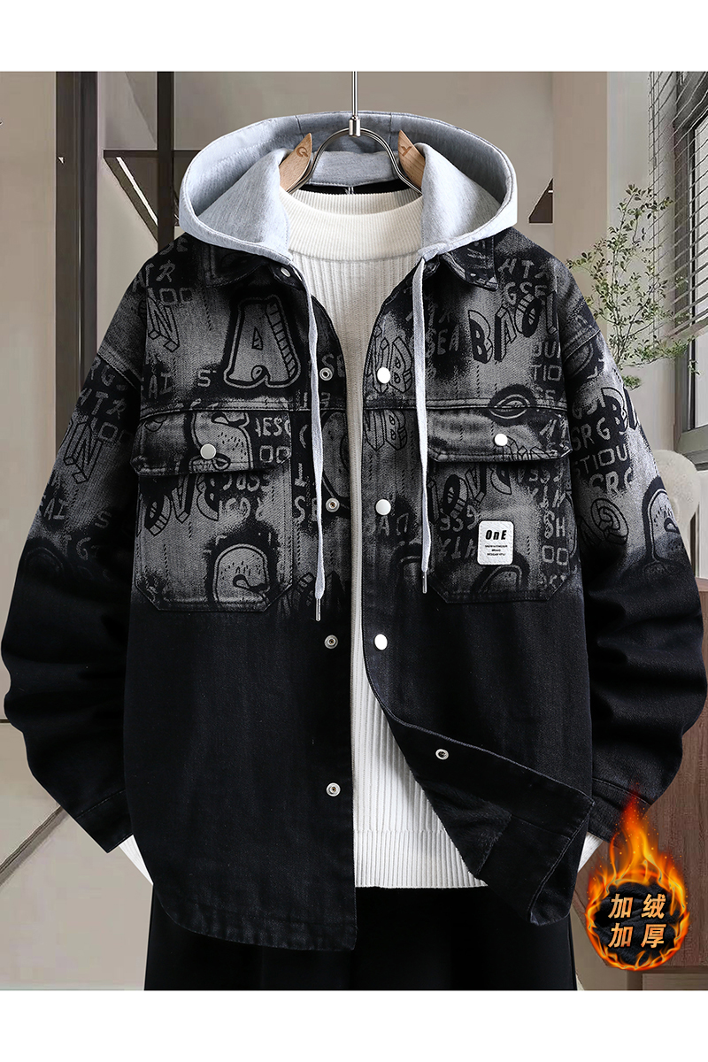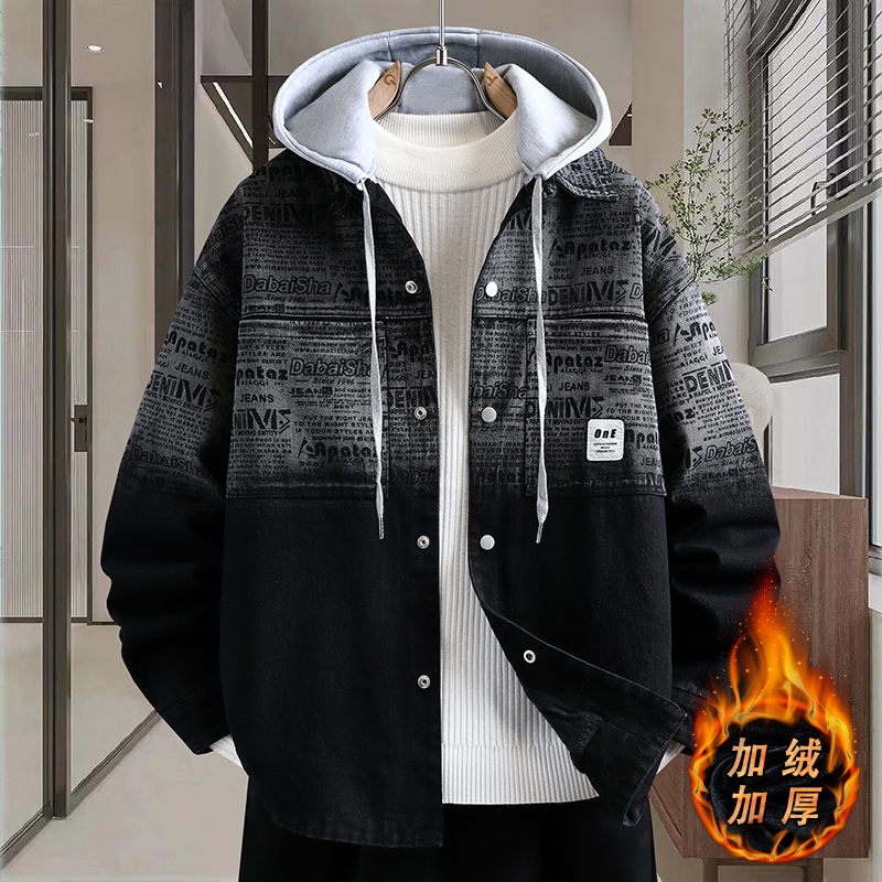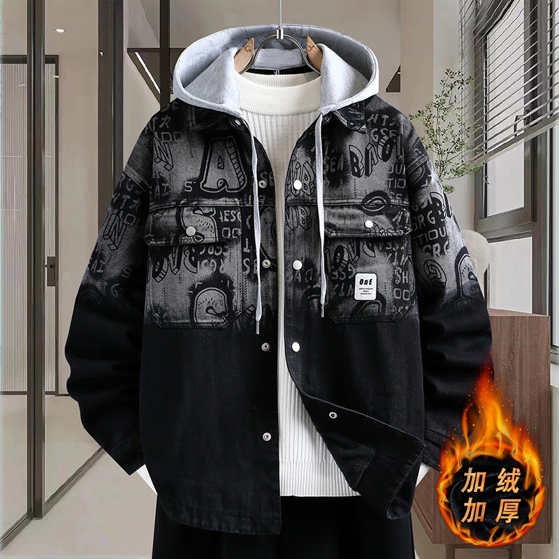 牛仔外套男冬季新款潮流加绒加厚痞帅宽松青少年连帽工装牛仔夹克 M 6637A款