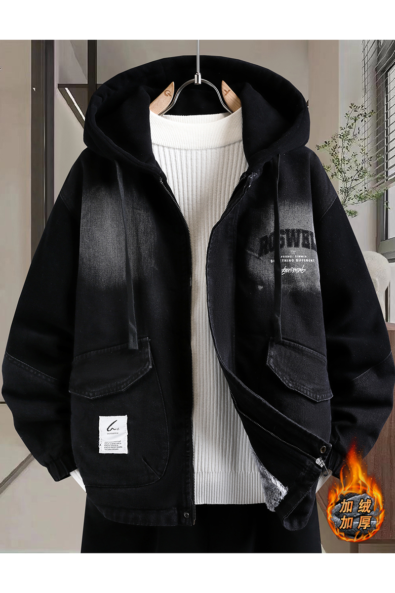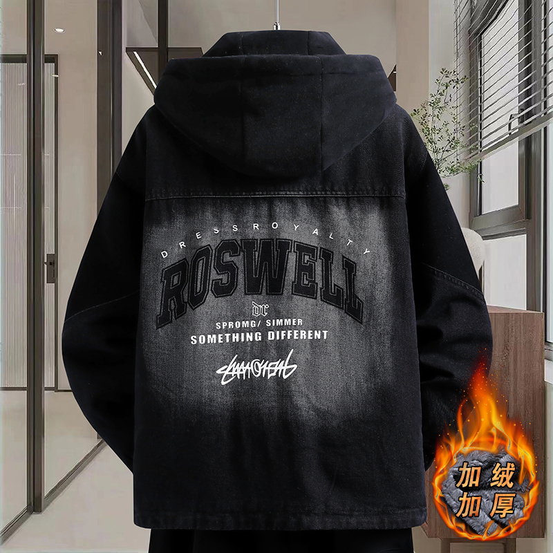 牛仔外套男冬季新款潮流加绒加厚痞帅宽松青少年连帽工装牛仔夹克 M 6637A款