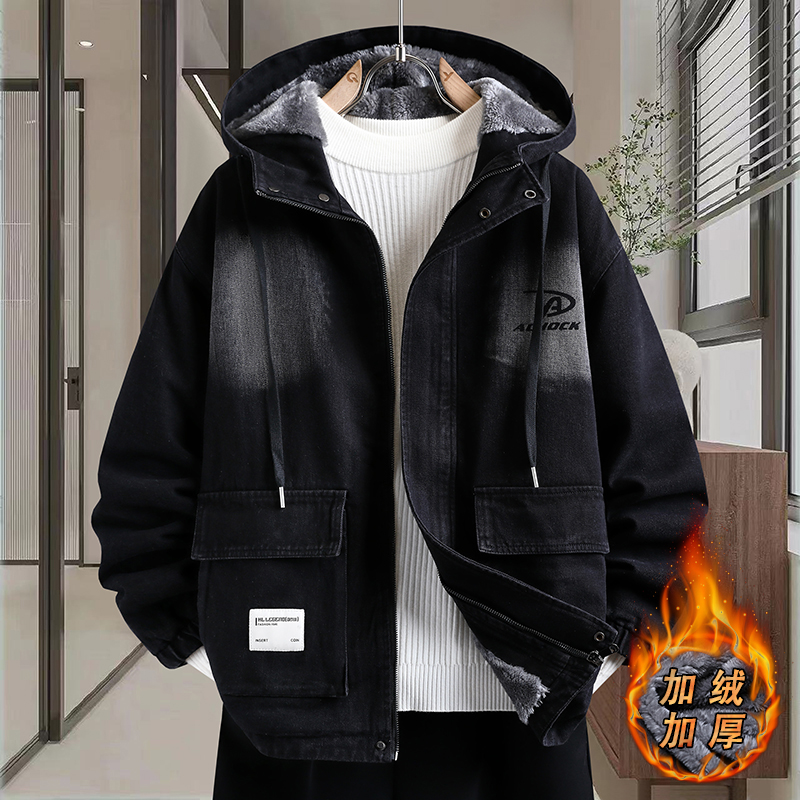 2025冬季新款连帽加绒加厚牛仔外套男青少年中学生保暖派克服夹克 M 649A款