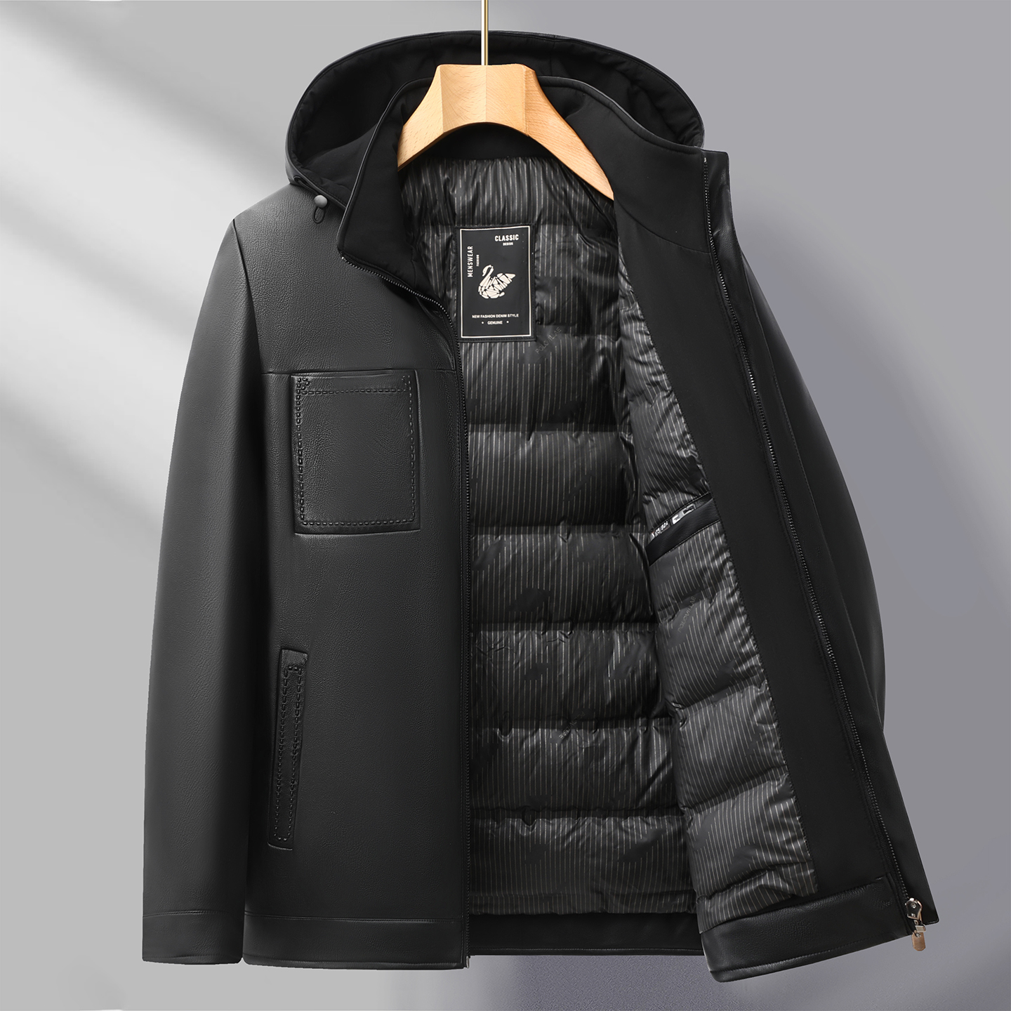 胖子男款冬季新款大码休闲连帽羽绒服加厚保暖PU皮羽绒衣宽松外套 L 黑色
