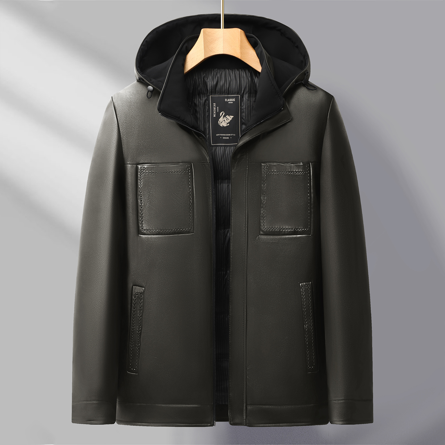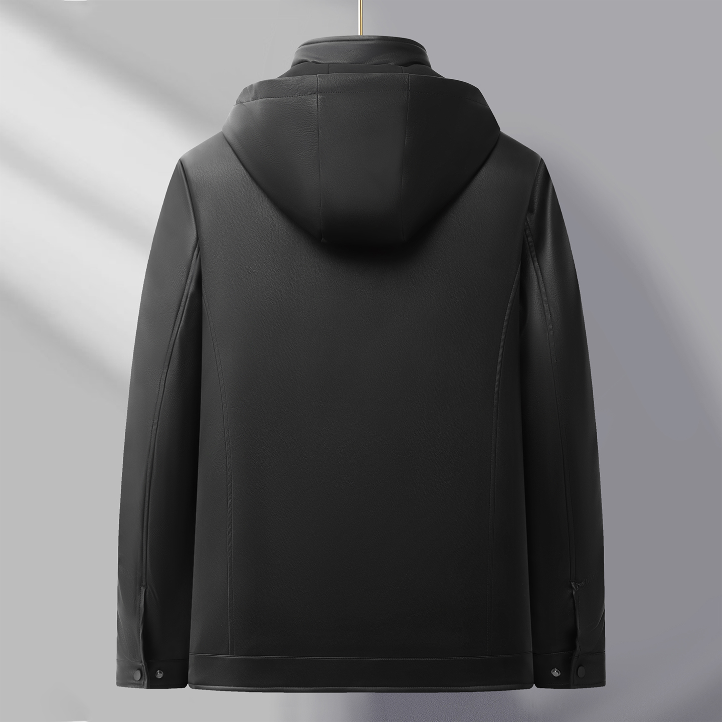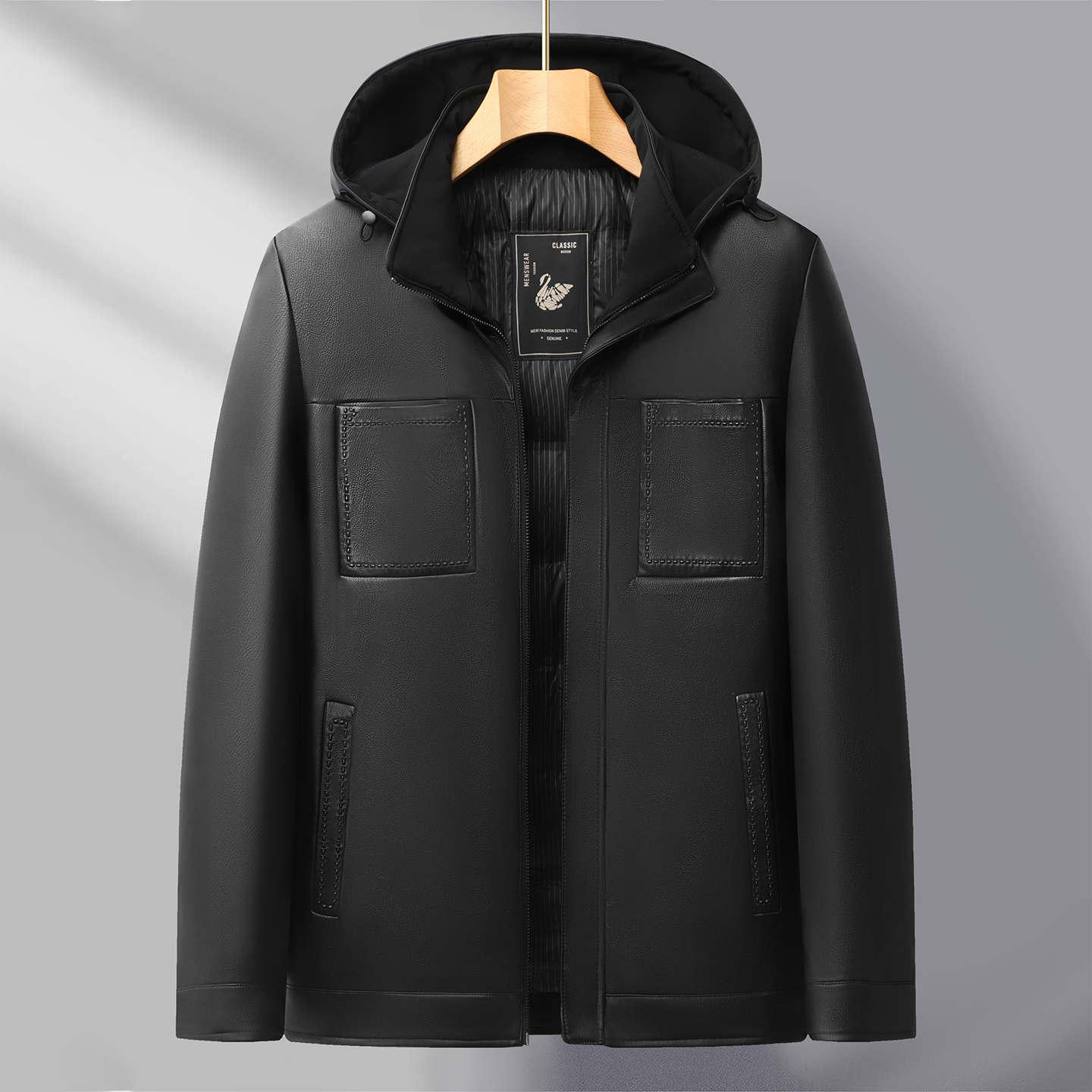 冬季新款胖子男装皮衣羽绒服加肥加大码PU皮连帽商务休闲外套 L 黑色
