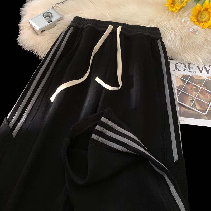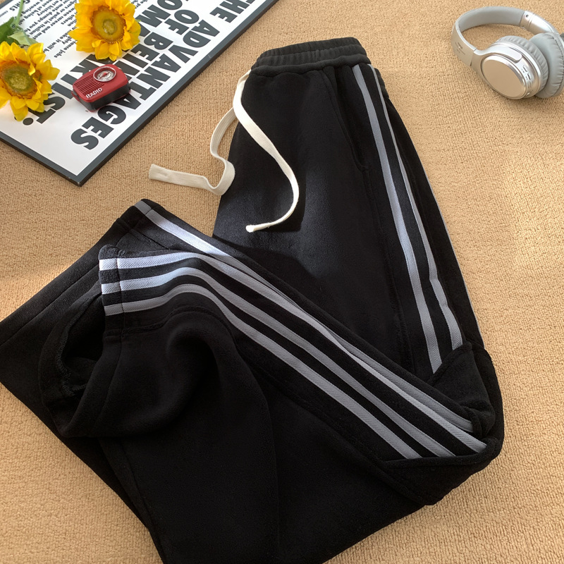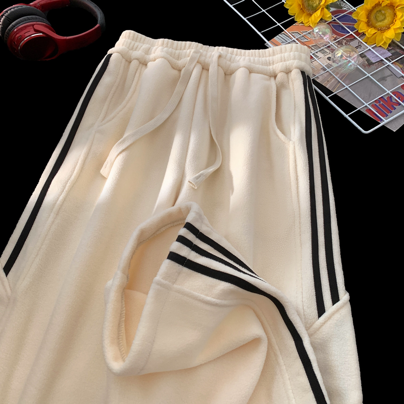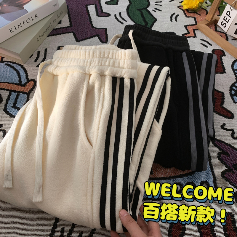 N2533 P32 重磅摇粒绒休闲裤男学生条纹加绒加厚运动卫裤冬 毛毯 M【90-110斤】 米白色