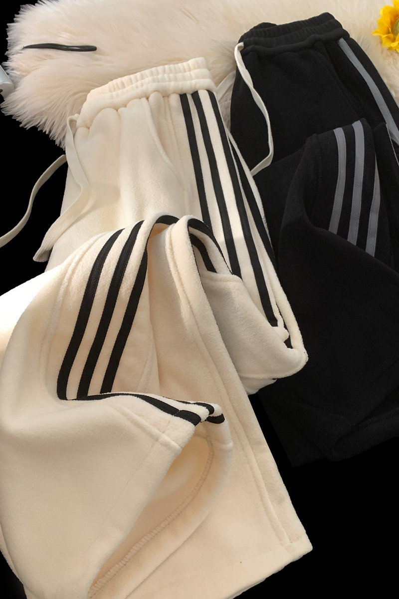 N2533 P32 重磅摇粒绒休闲裤男冬季学生条纹加绒加厚运动卫裤 3D M【90-110斤】 米白色