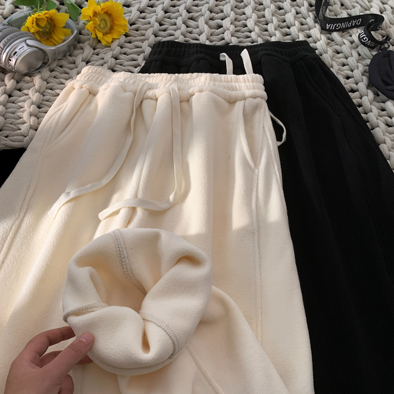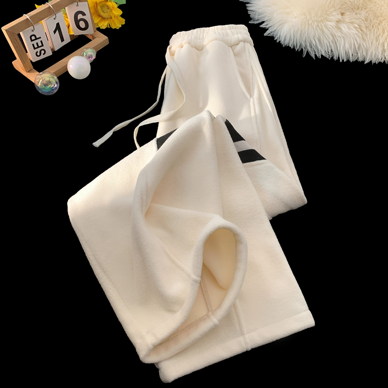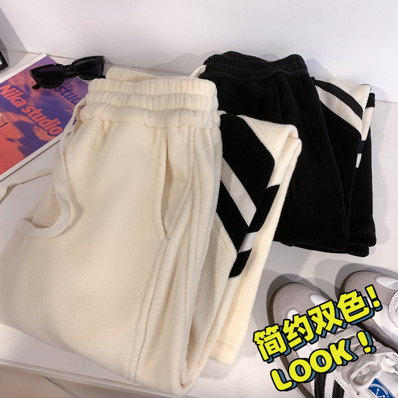 N2533 P32 重磅摇粒绒休闲裤男学生条纹加绒加厚运动卫裤冬 毛毯 M【90-110斤】 米白色