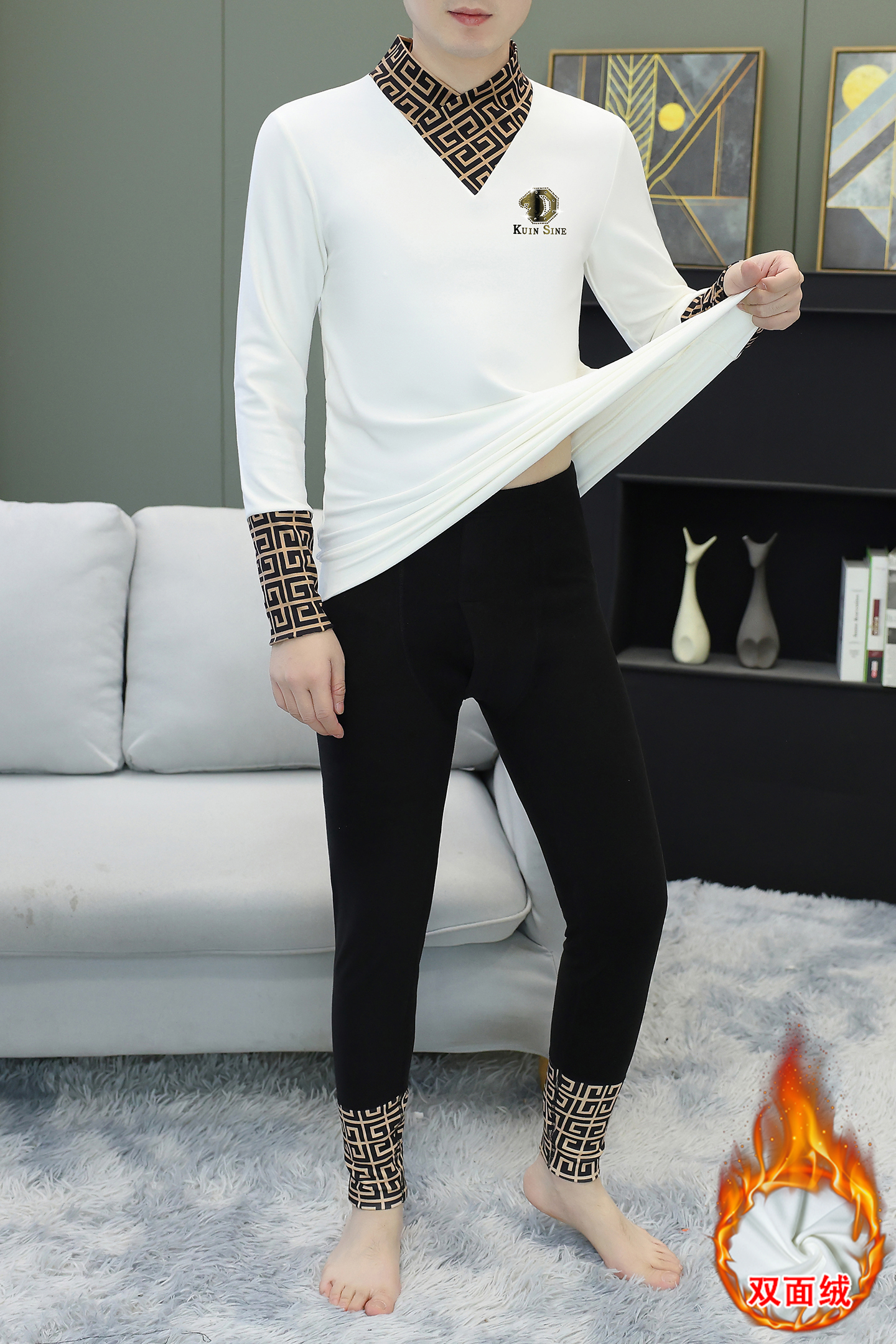 0577-群29冬季新款男士德绒假两件保暖内衣套装秋衣秋裤套装 M 白色
