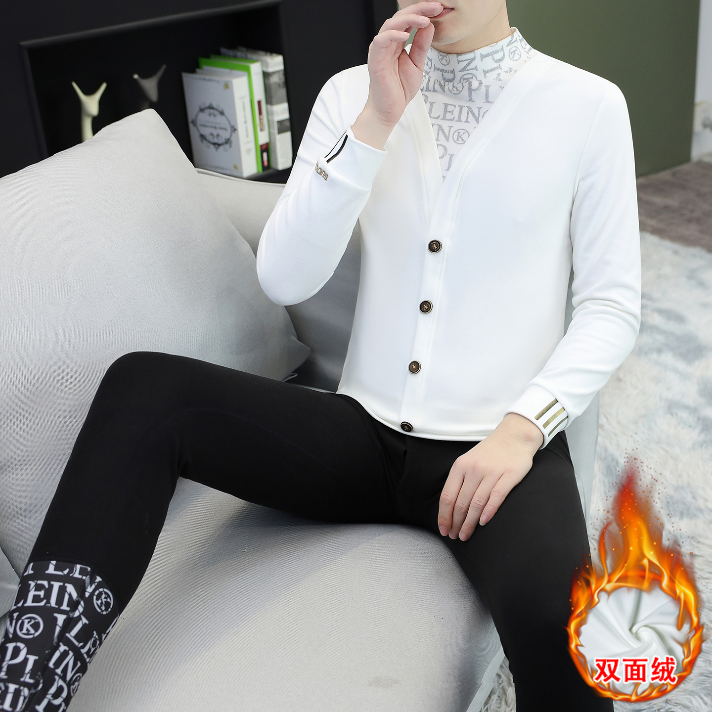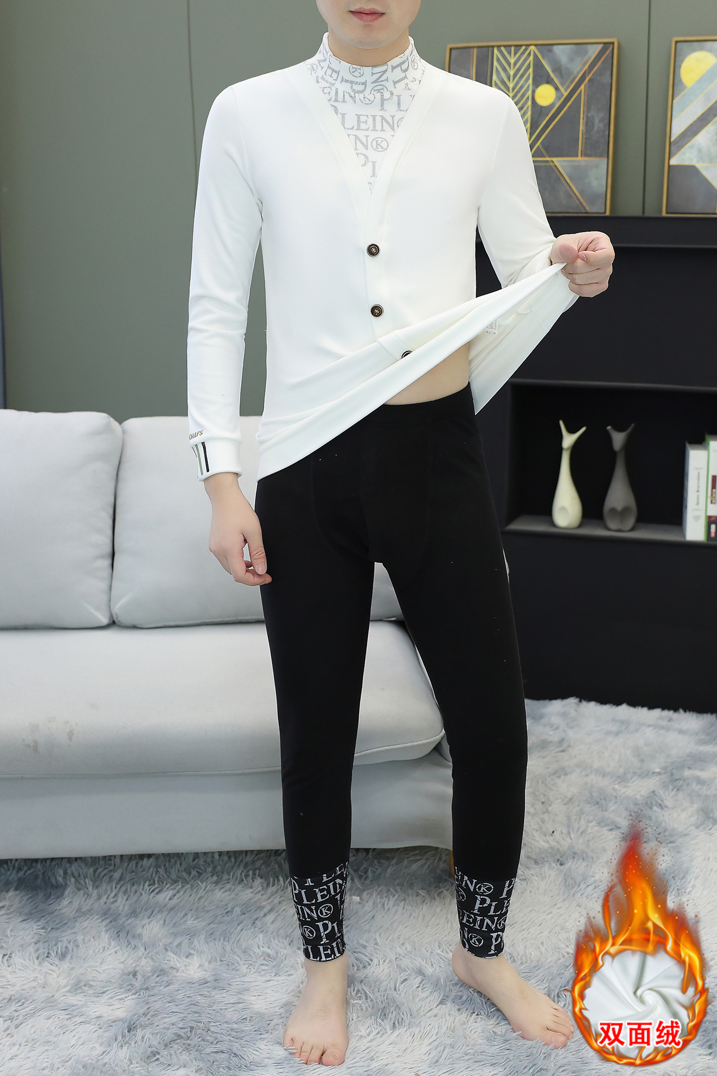 0577-群29冬季新款男士德绒假两件保暖内衣套装秋衣秋裤套装 M 白色