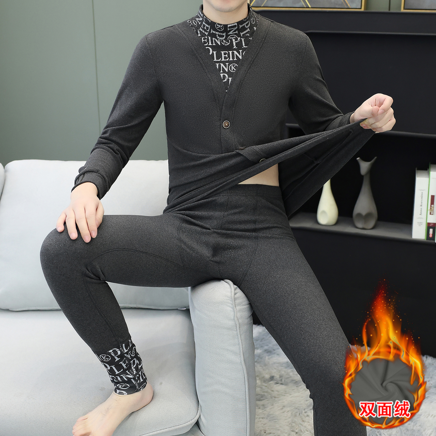 0577-群21冬季新款金丝绒保暖内衣套装男士加绒加厚V领保暖套装 M 黑色