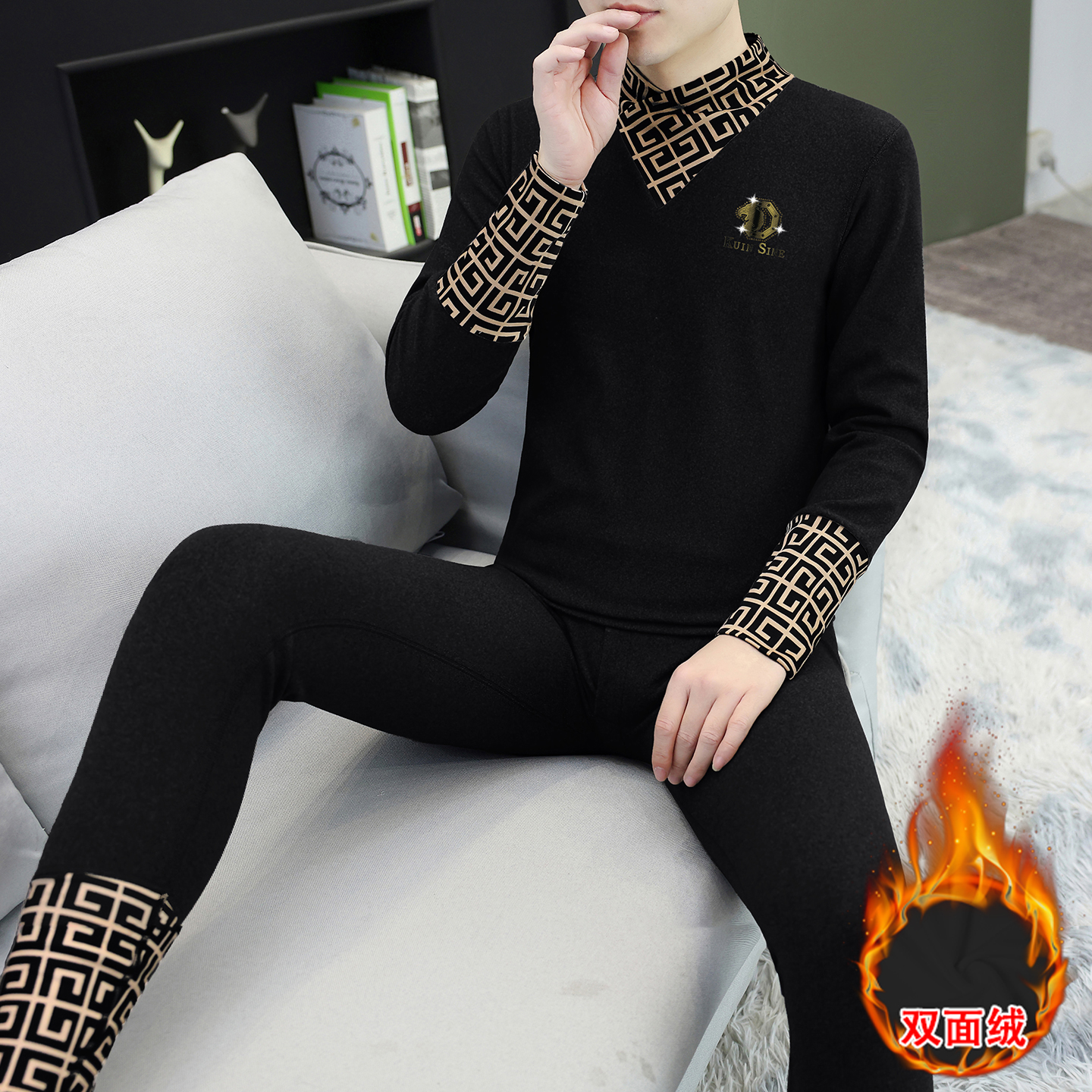 0577-群21冬季新款金丝绒保暖内衣套装男士加绒加厚V领保暖套装 M 黑色