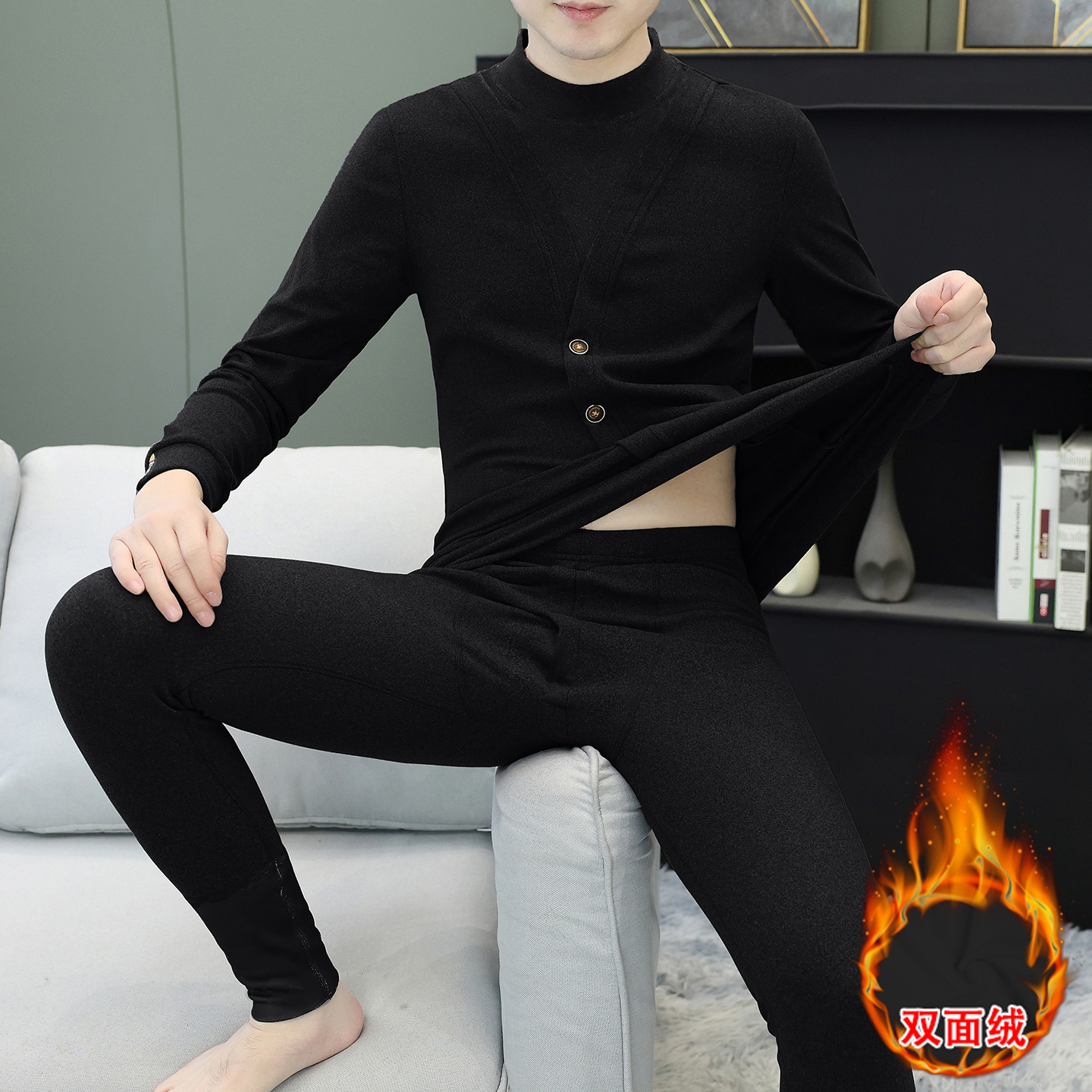 0577-群21冬季新款金丝绒保暖内衣套装男士加绒加厚V领保暖套装 M 黑色
