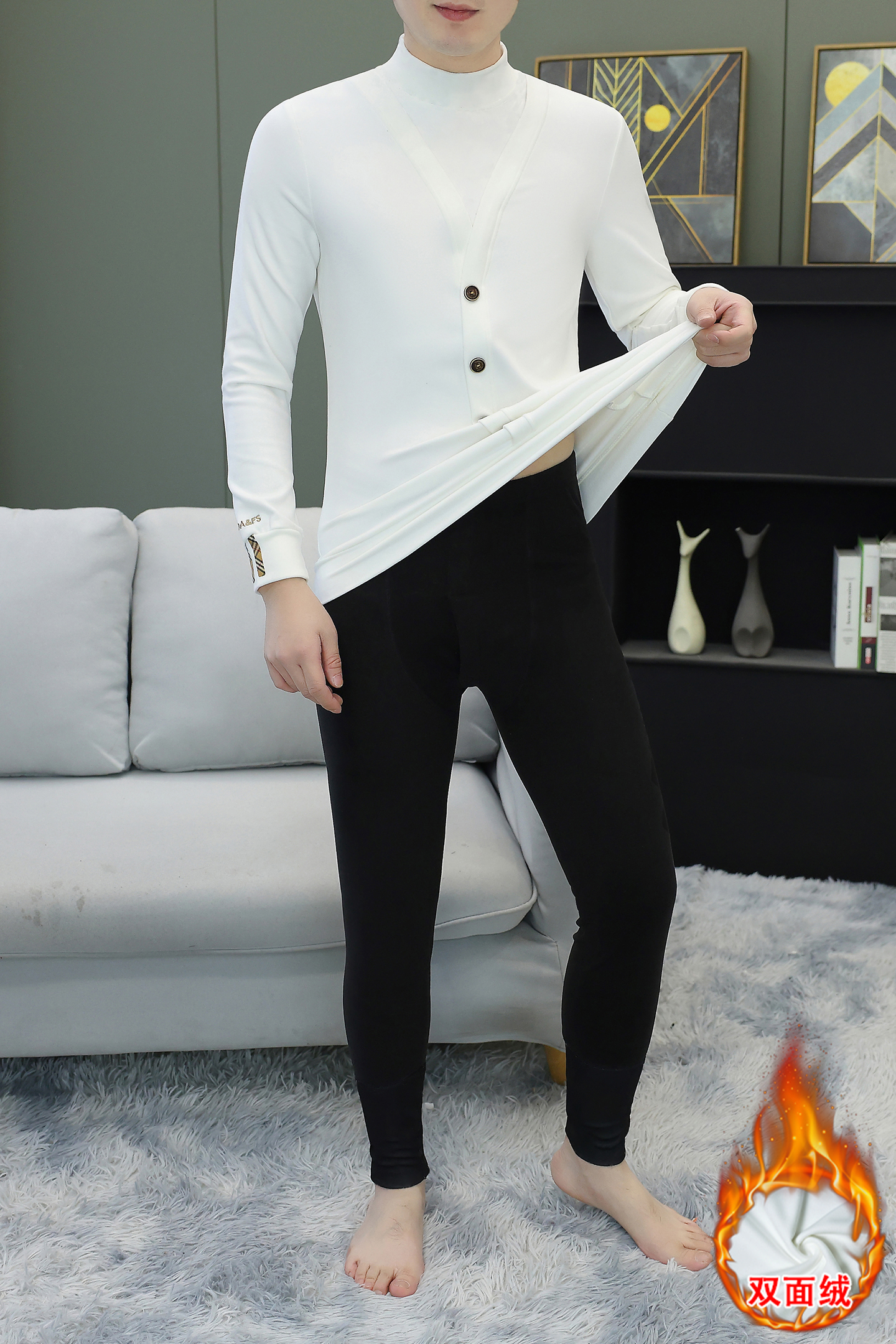 0577-群29冬季新款男士德绒假两件保暖内衣套装秋衣秋裤套装 M 白色