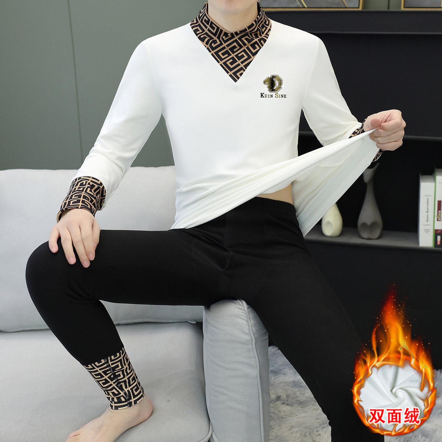 0577-群29冬季新款男士德绒假两件保暖内衣套装秋衣秋裤套装 M 白色
